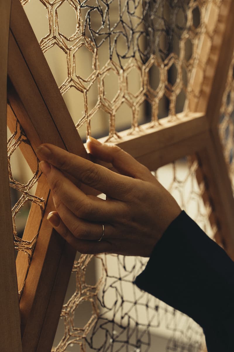 La artista, además de trabajar con la luz y la mirada, introduce sonido y las herramientas de la propia labor artesanal (bolillos y alfileres), enfatizando el carácter musical del proceso de producción. La pieza sonora mezcla grabaciones del sonido de la encajera con el sonido de las fuentes de la Alhambra, invitando al espectador a habitar la obra y a tener, como sucede en el monumento nazarí, una experiencia inmersiva más allá de lo visual.