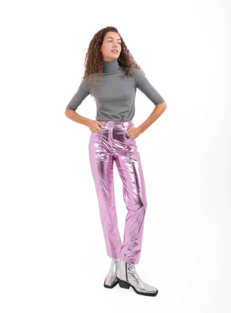 Pantalon metalizado de Laagam en color rosa para elevar cualquier look. Disponible en su web.