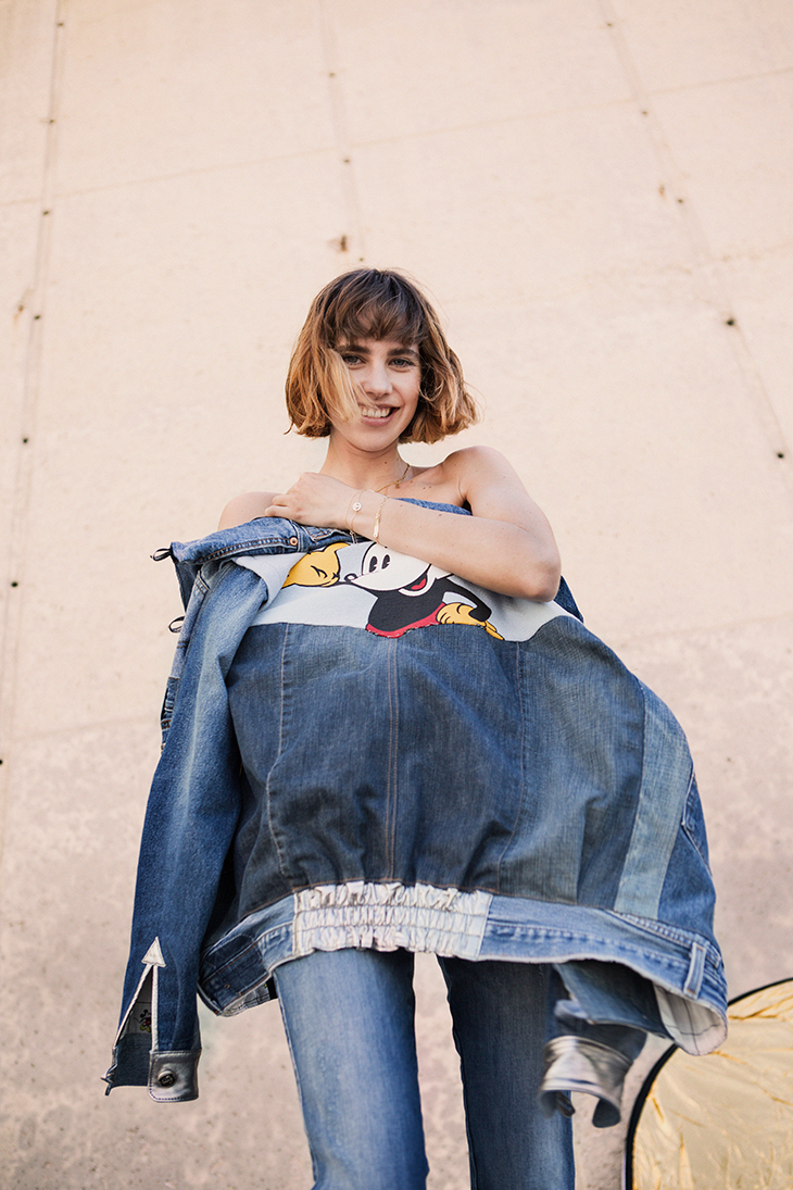 La musica Brisa Fenoy con The Iconic Jacket Desigual y la figura de Mickey Mouse original a la espalda
