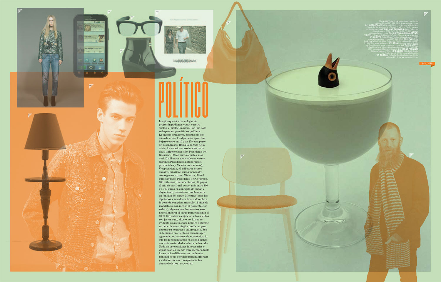 Sin duda, la causa principal de la mala reputación de la clase política española se debe a los numerosos casos de corrupción que suben diariamente a los titulares de la prensa. Este hecho, unido a la falta de medidas eficaces que solucionen la actual crisis económica y sus consecuencias, hace que sea lógico que la opinión pública cuestione la credibilidad y preparación de nuestros dirigentes. A pesar de la honradez y buenas intenciones de la gran mayoría, lo cierto es que, por lo general, estos profesionales, servidores públicos, se presentan ante la sociedad con un estilismo, en el caso de los hombres, más propio de un banquero (cosa que no parece lo más adecuado en los tiempos que corren). La representación femenina es mucho más versátil y correcta, salvo alguna que pretende emular inapropiadamente a Anna Wintour. Todo esto nos ha hecho pensar que, por el bien de la democracia, sería buena idea dedicar un cuaderno de estilo a los políticos. Un ejercicio que transforme la percepción negativa de la ciudadanía mediante la propuesta de un look más acorde a la coyuntura nacional, consecuente en apariencia con la precariedad del estado y que a la vez manifieste dedicación plena al desempeño de sus funciones. En definitiva, reivindicamos la recuperación del rollo progre de los años 70 con un toque folk y vintage. Proclamamos al dénim como tejido democrático por excelencia, y por tanto votamos a favor de su aceptación absoluta, sin miramientos, tanto en actos oficiales como en el Congreso de los Diputados y el Senado. Abolimos el término “formal”, relacionado a la vestimenta, sustituyéndolo por el de “laboral” o “legal”, discrepando totalmente con José Bono sobre la utilización de la corbata como símbolo de corrección, ya que también lo es de corrupción.