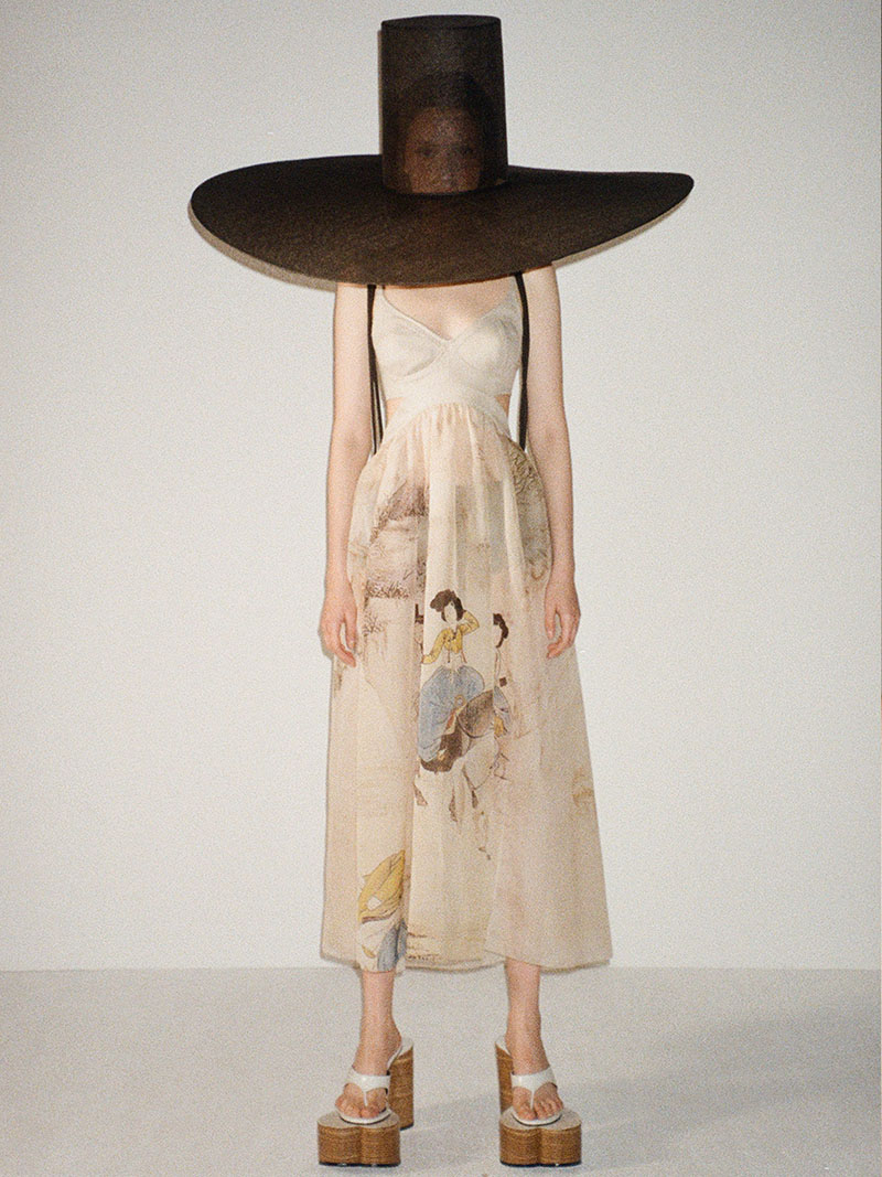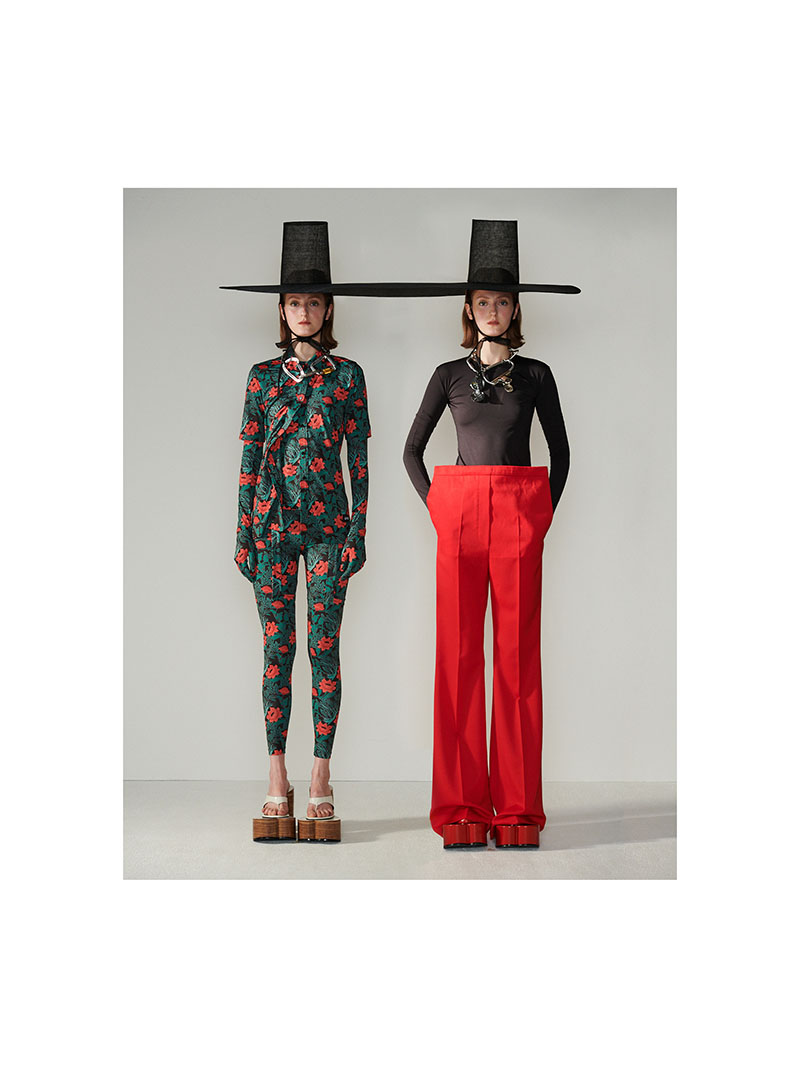 Estas prendas más “tradicionales” (dentro de lo tradicional que es Park Segun Gun), se combinan con el otros elementos caraceterísticos del país de origen del diseñador, con esto consigue representar ese mix & match en el que se enfrentan las tradiciones orientales con las tendencias más actuales. El sombrero “Gat” tradicional coreano es uno de esos elementos que hacen que la colección tenga un ritmo más animado y atrayente.