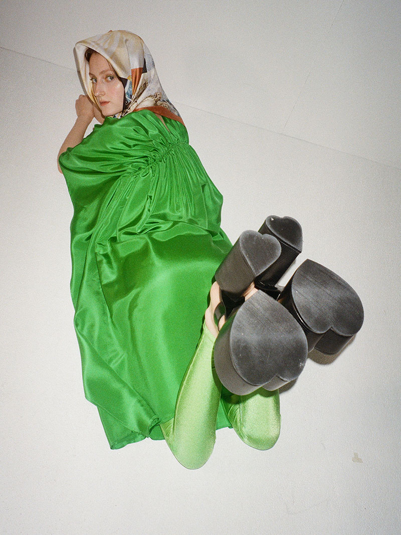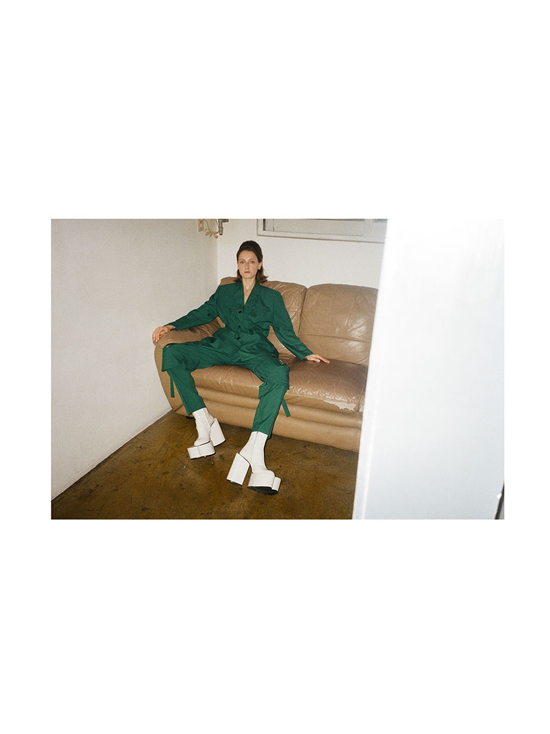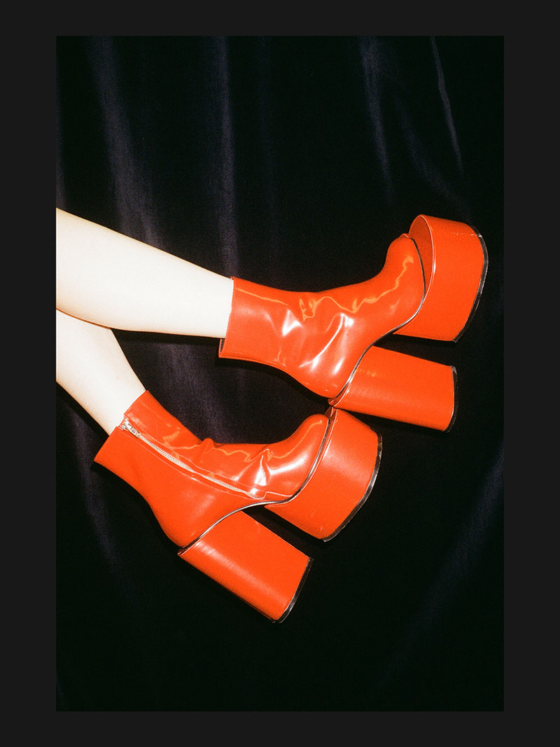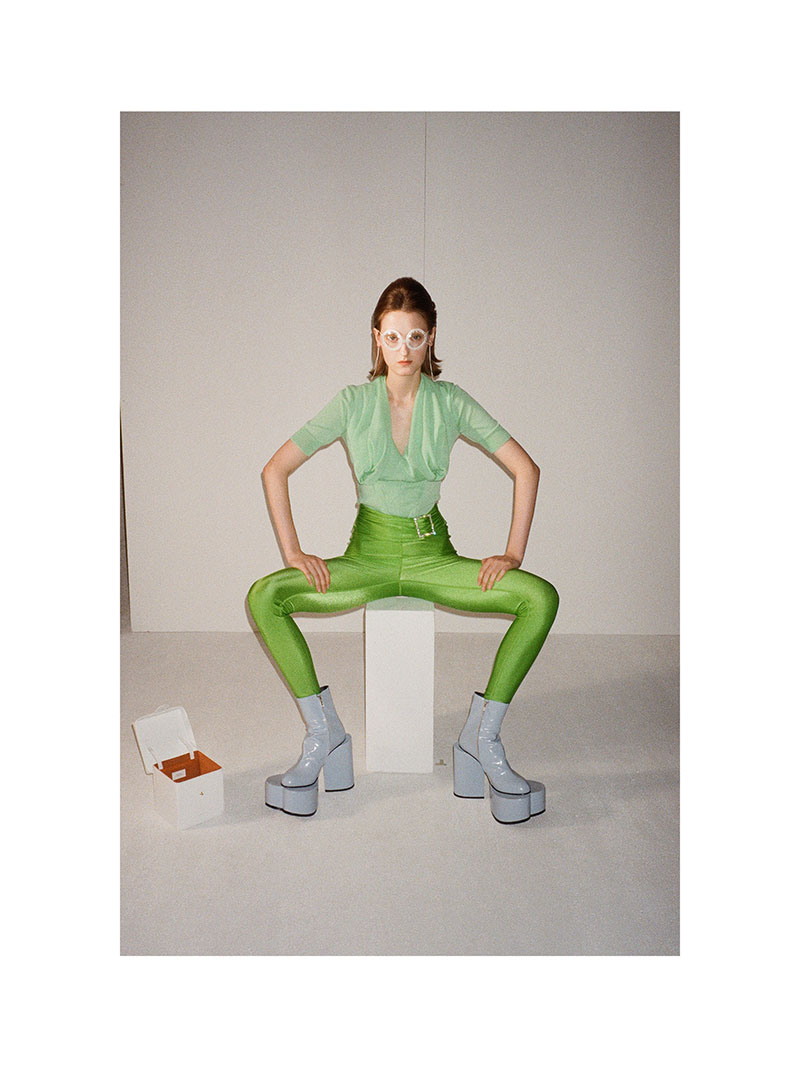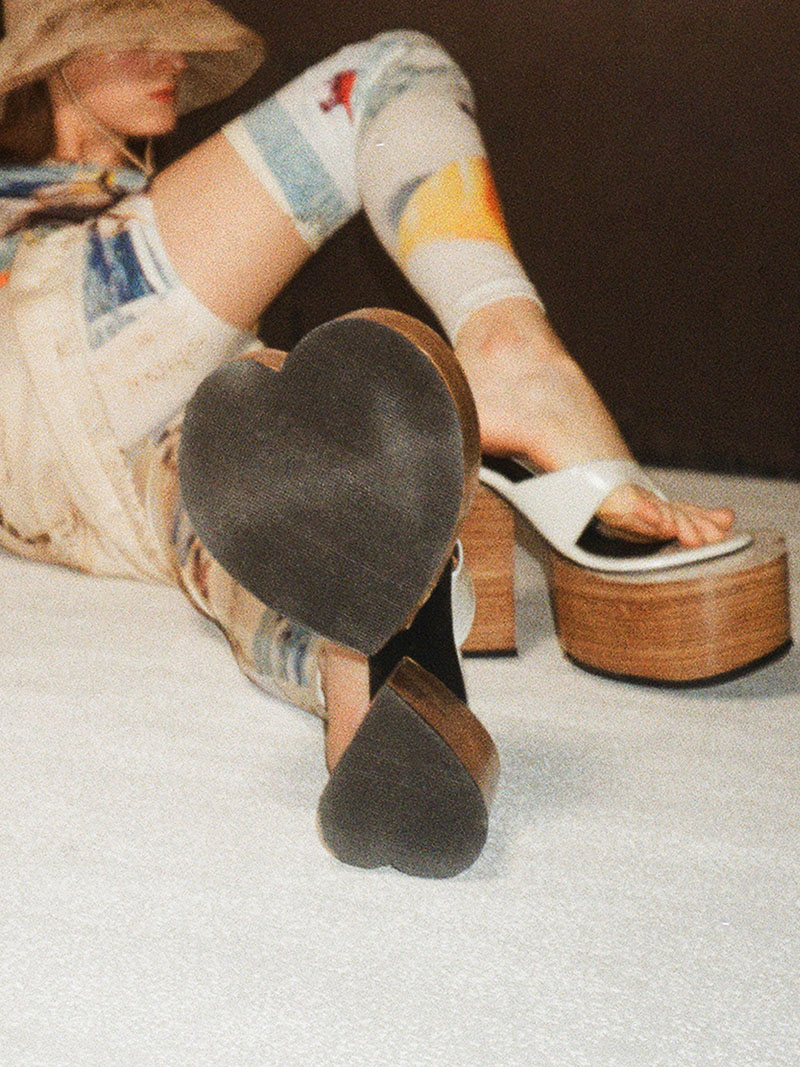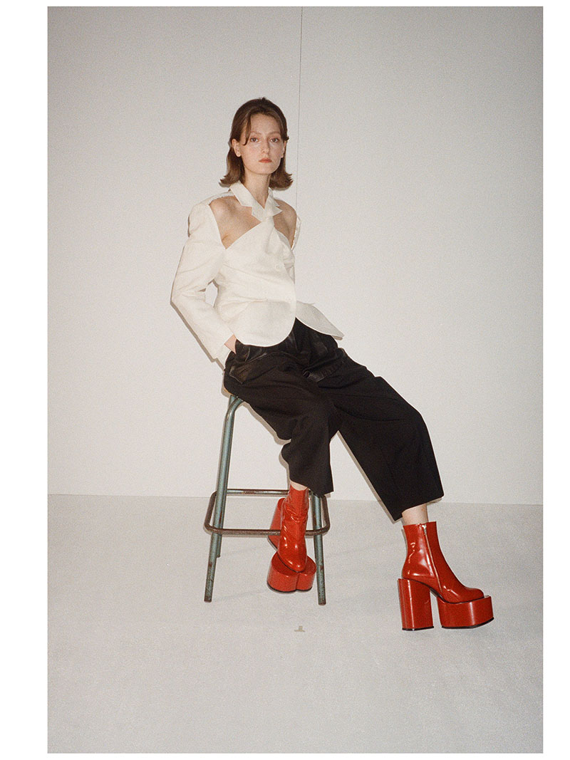 La pieza que más llama la atención de esta nueva entrega de PushButton SS21 son los tacones con plataforma XXL en forma de corazón, que hace que cada uno de los looks, llenos de contrastes sofisticados y modernos, se conviertan en un claro ejemplo del “Neo Post Contemporary Look” que defiende el diseñador con esta nueva propuesta.