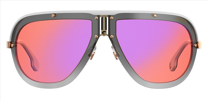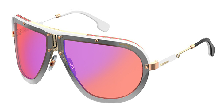 Arriba y Abajo: Gafas CARRERA AMERICANA. Las tienes en seis combinaciones de colores muy spring summer: rosa con varillas blancas y terminales negros, lentes de color naranja flash claro con toques azules en las varillas de doradas; también con lentes azul claro en contraste con detalles rojos en las varillas, también doradas… y una versión totalmente negra con metal en rutenio… más una opción de lentes degradadas marrones con varillas de metal dorado y terminales negros… y, por último, uns versión con lentes amarillas flash combinadas con detalles dorados de metal.