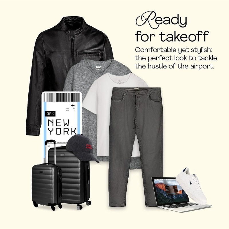 Este es, quizás, uno de los mejores looks que podemos tener pensado a la hora de salir con prisa. Si vamos al aeropuerto, y no queremos vernos como un despojo, podemos apostar por una combinación en escala de grises de camiseta básica, jersey gris y cazadora de cuero negra de estilo clásico. Siguiendo con el look, podemos pensar en unos jeans más arreglados y una gorra (peinarse es un lujo que desaparece con las prisas). Y todo lo podemos cerrar con algo que nunca falla: unas zapatillas blancas y atemporales.