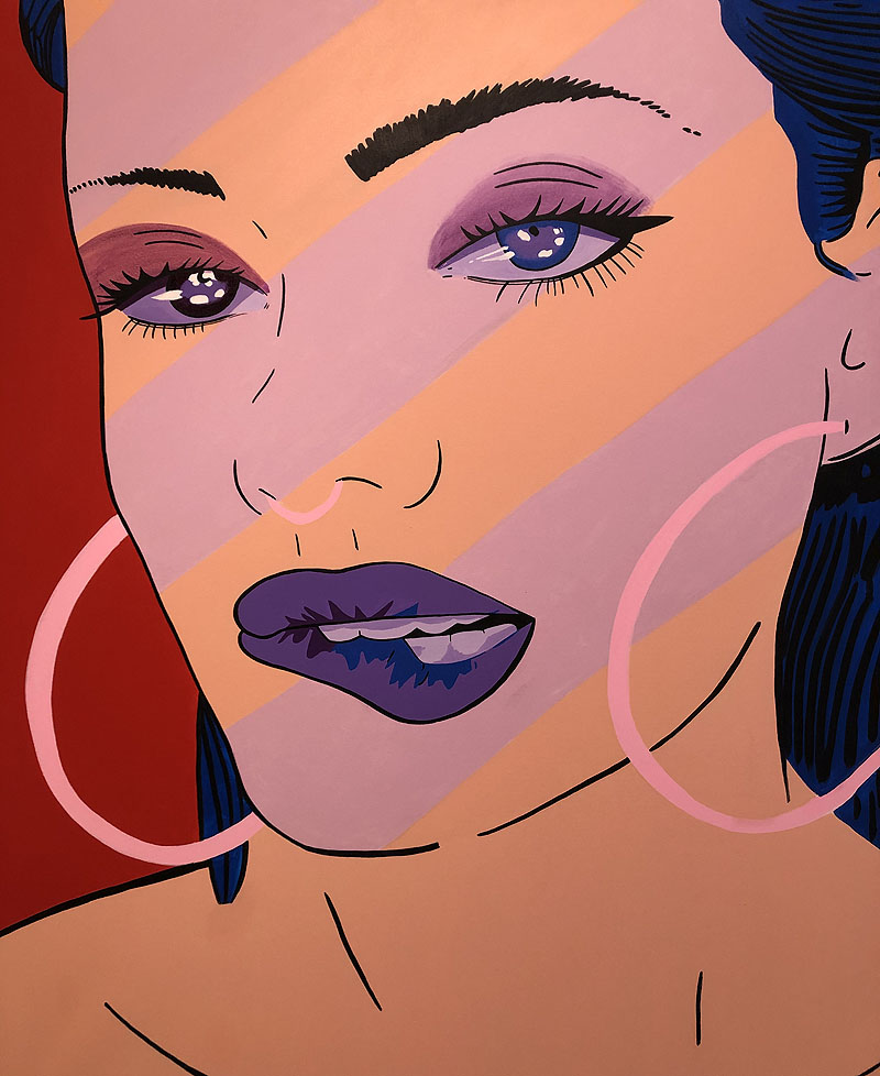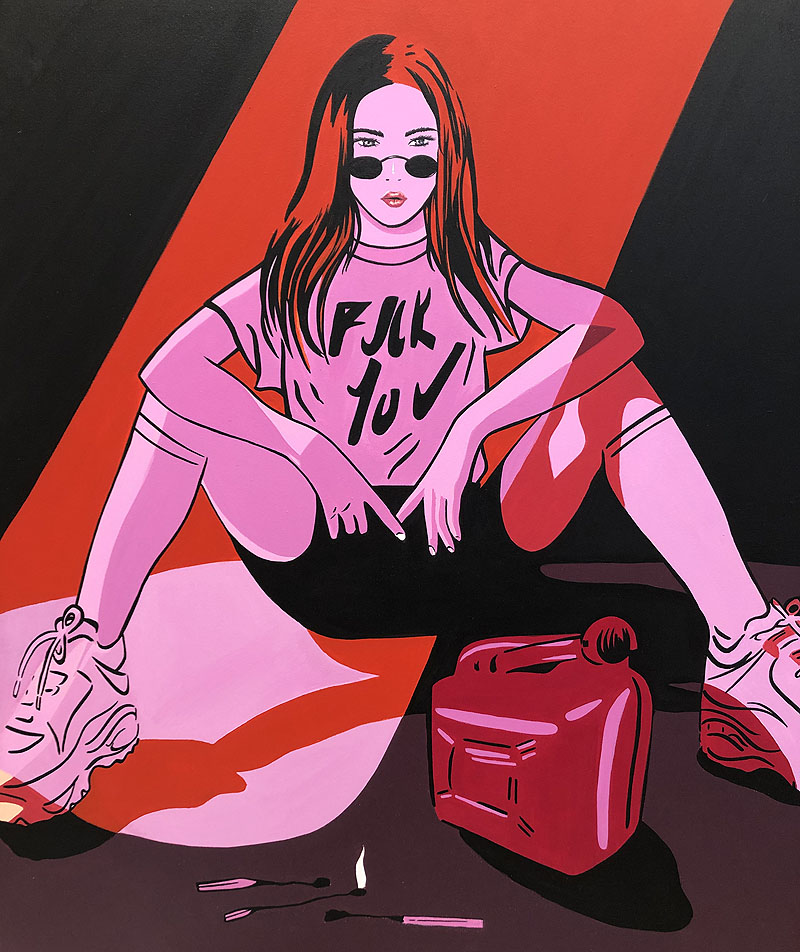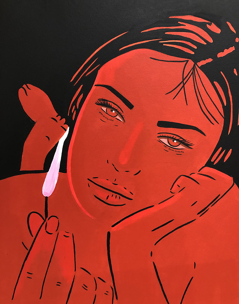 Cuando Bebi y y nos conocimos tuvimos un inmediato flechazo artístico. Sólo faltaba elegir cómo queríamos colaborar. Decidimos que ilustraría uno de sus libros, el que recoge sus diarios poéticos adolescentes. Ella los había escrito entre los doce y los dieciocho años, así que están embadurnados de la intensidad de las primeras veces: los primeros amores eternos, los primeros dolores, los primeros desengaños, las rabias primeras… El reto era trasladar esa voz quinceañera a los pinceles de alguien que ya está en la treintena. Yo estoy muy satisfecha del resultado. Una vez publicado el libro sentí la necesidad de llevar las ilustraciones digitales a mi hábitat más natural: el lienzo, los acrílicos y el gran formato. Ahí surgió la exposición “Amor y asco“.