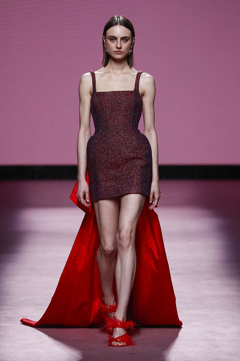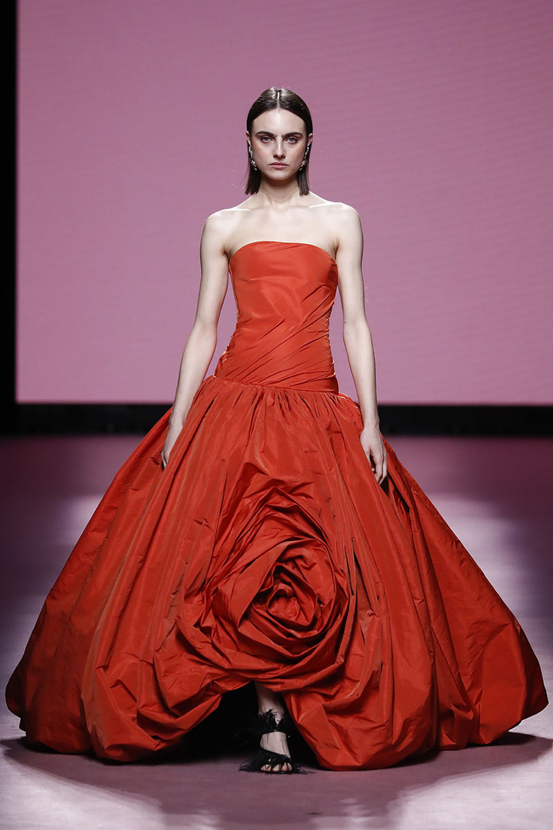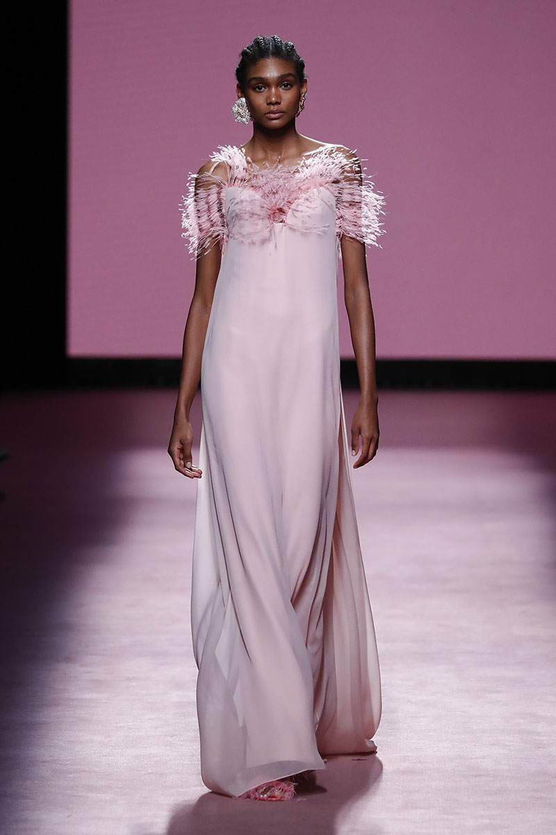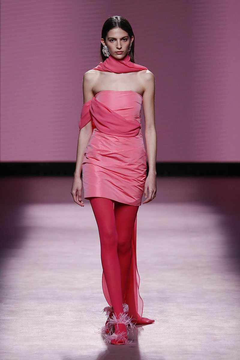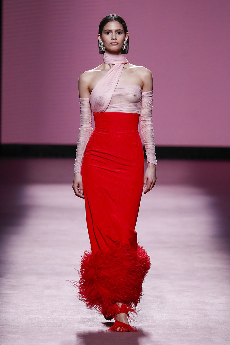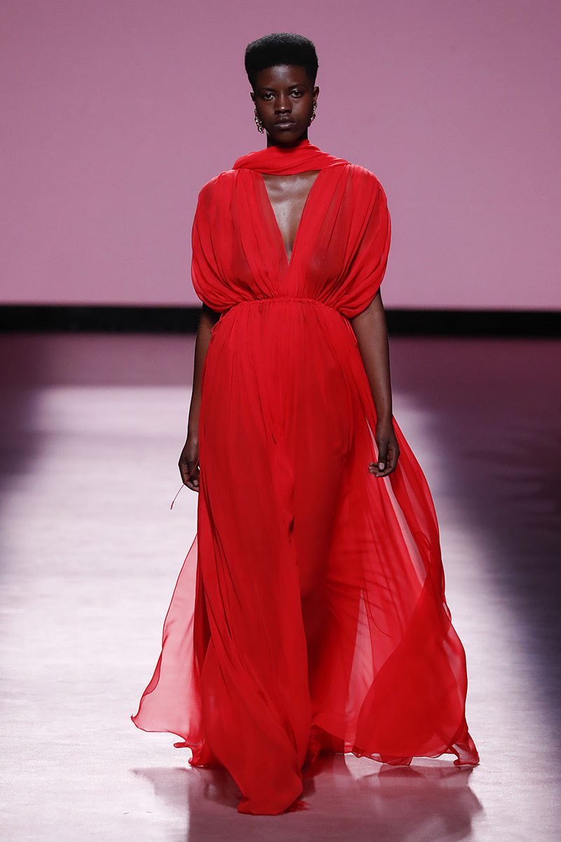 Siluetas muy versátiles, desde mini y maxi vestidos, pasando por trajes de chaqueta reinventados, gabardinas sofisticadas y faldas ajustadas, hasta tricot y tops. La propuesta del diseñador incluía una gran variedad de tejidos naturales como el algodón desflecado, bordados sobre tul, satenes de seda, lanas tejidas con cashmere, viscosas satinadas, plumas de avestruz, devoré en terciopelo… que se teñían de vibrantes colores como el rojo, el rosa, el naranja y el lima contrastados con otros más suaves como el crudo, el negro, o el azul marino.