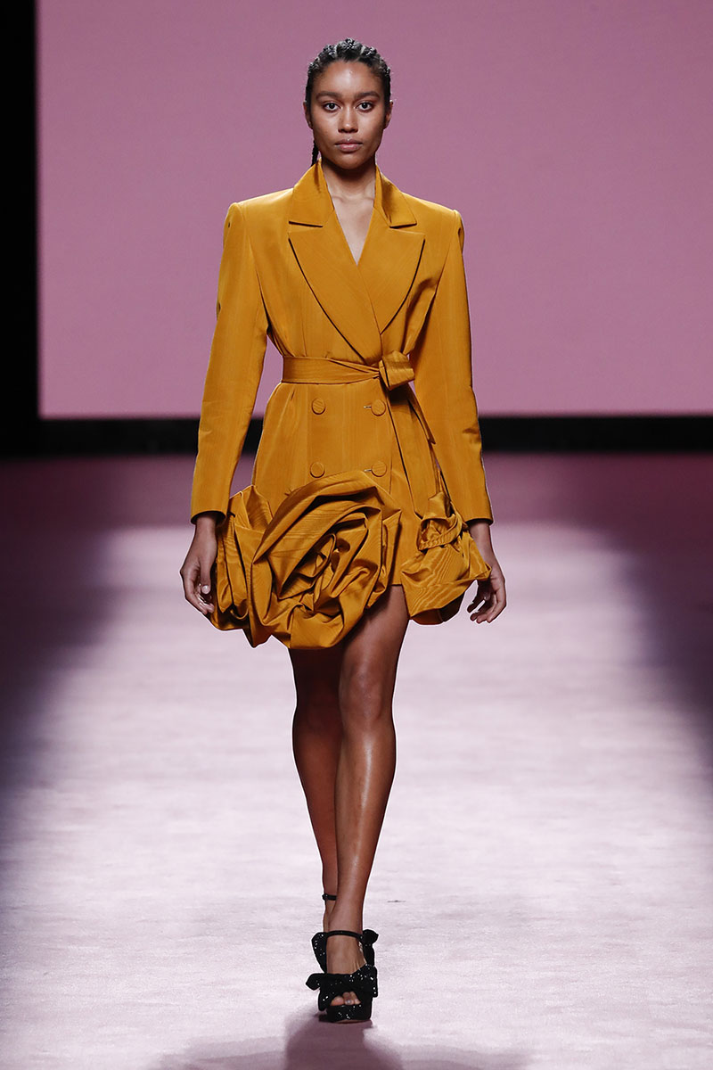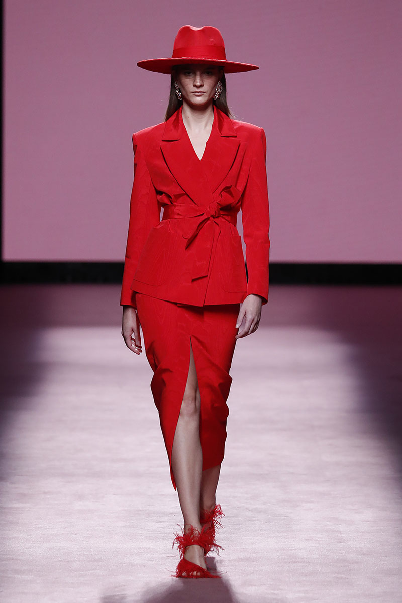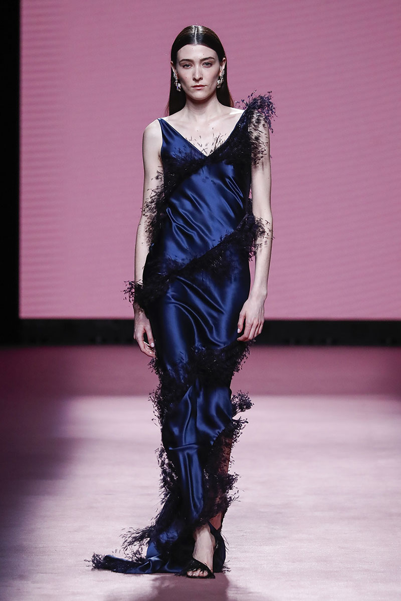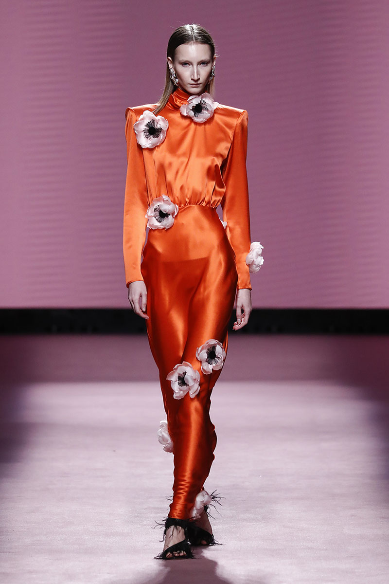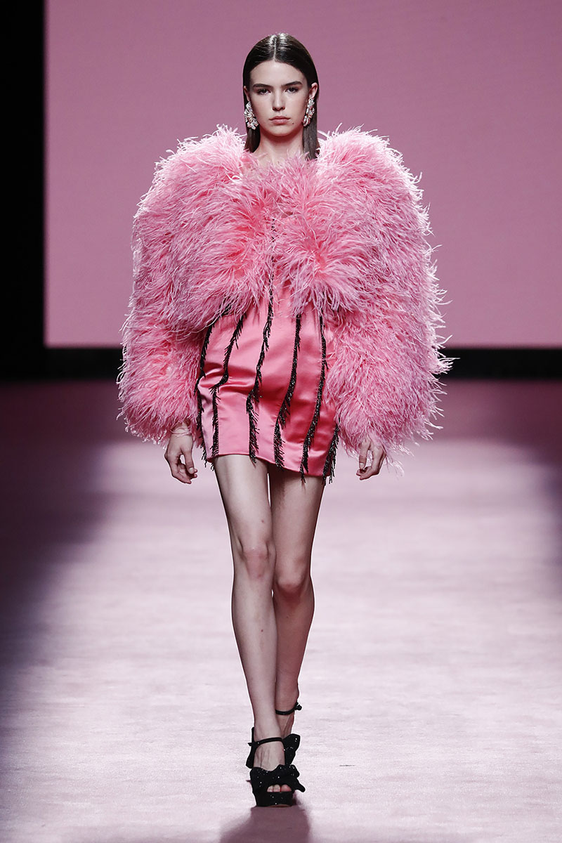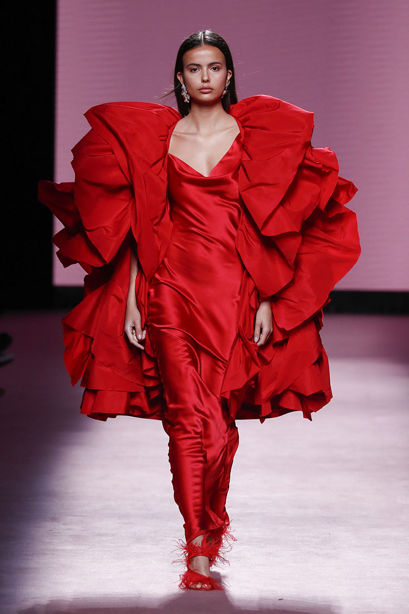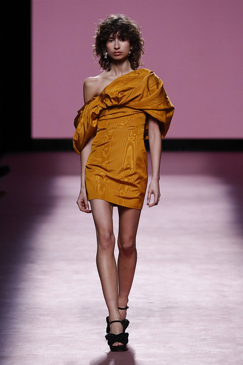 Siluetas muy versátiles, desde mini y maxi vestidos, pasando por trajes de chaqueta reinventados, gabardinas sofisticadas y faldas ajustadas, hasta tricot y tops. La propuesta del diseñador incluía una gran variedad de tejidos naturales como el algodón desflecado, bordados sobre tul, satenes de seda, lanas tejidas con cashmere, viscosas satinadas, plumas de avestruz, devoré en terciopelo… que se teñían de vibrantes colores como el rojo, el rosa, el naranja y el lima contrastados con otros más suaves como el crudo, el negro, o el azul marino.