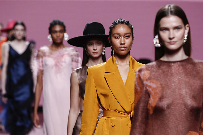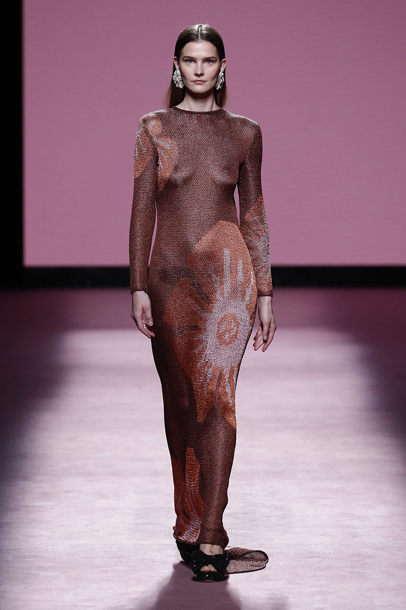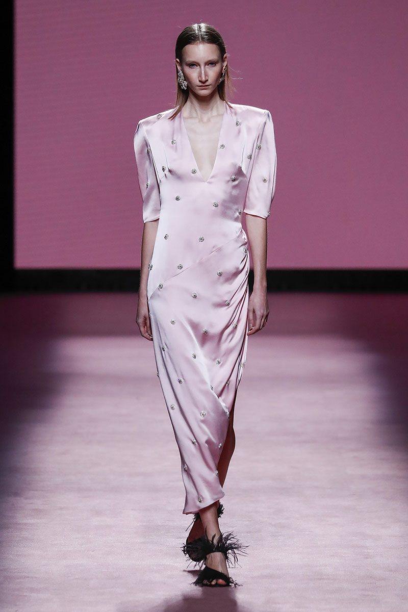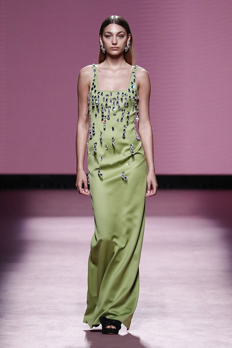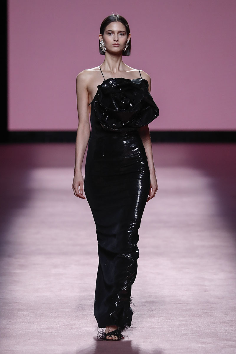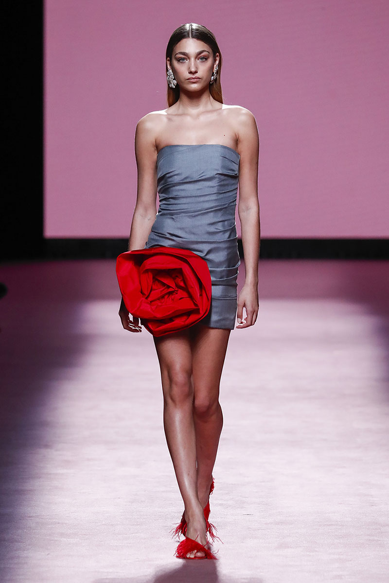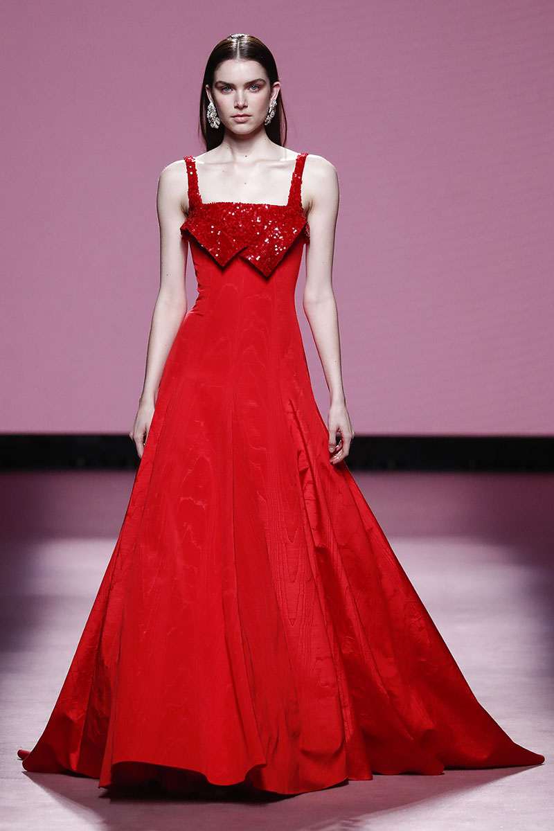 Siluetas muy versátiles, desde mini y maxi vestidos, pasando por trajes de chaqueta reinventados, gabardinas sofisticadas y faldas ajustadas, hasta tricot y tops. La propuesta del diseñador incluía una gran variedad de tejidos naturales como el algodón desflecado, bordados sobre tul, satenes de seda, lanas tejidas con cashmere, viscosas satinadas, plumas de avestruz, devoré en terciopelo… que se teñían de vibrantes colores como el rojo, el rosa, el naranja y el lima contrastados con otros más suaves como el crudo, el negro, o el azul marino.