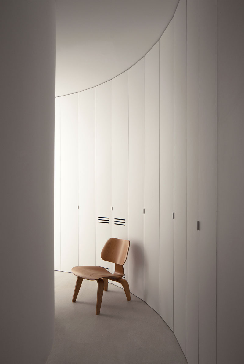 La introducción de la geometría curva en los elementos de compartimentación, permite romper la perspectiva en los espacios de paso dotados de amplitud y escala suficiente pasando a convertirlos en espacios de oportunidad donde incluso poder desarrollar pequeños rincones estanciales domésticos.