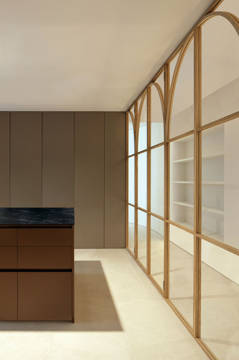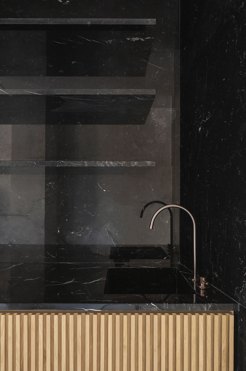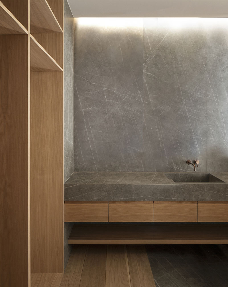 El empleo cuidadoso y puntual de materiales nobles en elementos de mobiliario diseñados en piedra negra y gris verdosa, junto con elementos de madera de roble natural combinados con metales como el cobre y el bronce, consiguen imprimir un cierto hilo conductor que aporta carácter y calidad dentro de la uniformidad ambiental de la vivienda”.