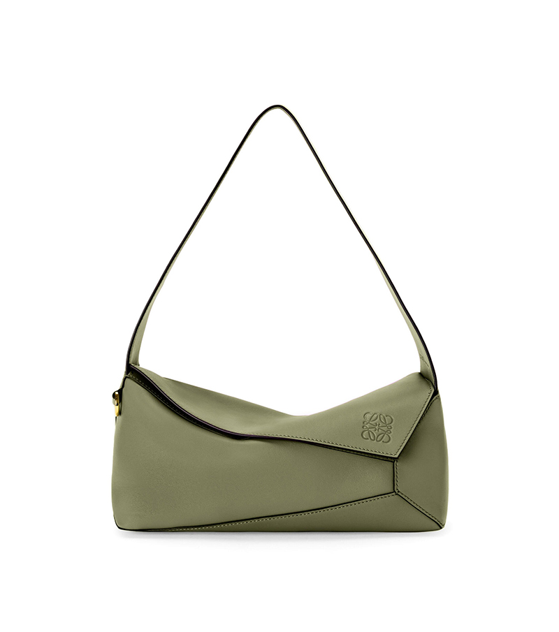 El Puzzle fue la primera silueta que introdujo Jonathan Anderson tras haber asumido las riendas de Loewe. Gracias a su silueta cuadrada y cortes geométricos, este bolso en piel napa se ha convertido en un favorito de las nuevas generaciones y algunas madres muy cool. Con esto en mente os proponemos la versión Hobo, pensada para llevarse al hombro en vez de ser una bandolera. Y claro, al ser un bolso diferente, también hay que apostar por un color distinto… como este verde aguacate.