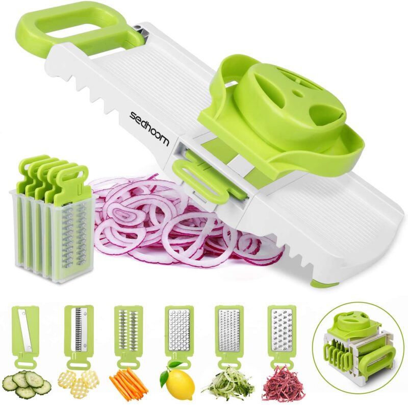 Un seis en uno. Las seis cuchillas de este cortador de verduras se pueden seleccionar en varias formas, como trituradas, cortadas, cortadas en rodajas de flores, fresadas, etc., para dar la textura que quieras a tus platos. Equipado con protectores de manos profesionales, manijas de seguridad, agarre cómodo y silicona antideslizante en la parte inferior para evitar el deslizamiento durante el uso, es importante que sea firme y estable para evitar accidentes.