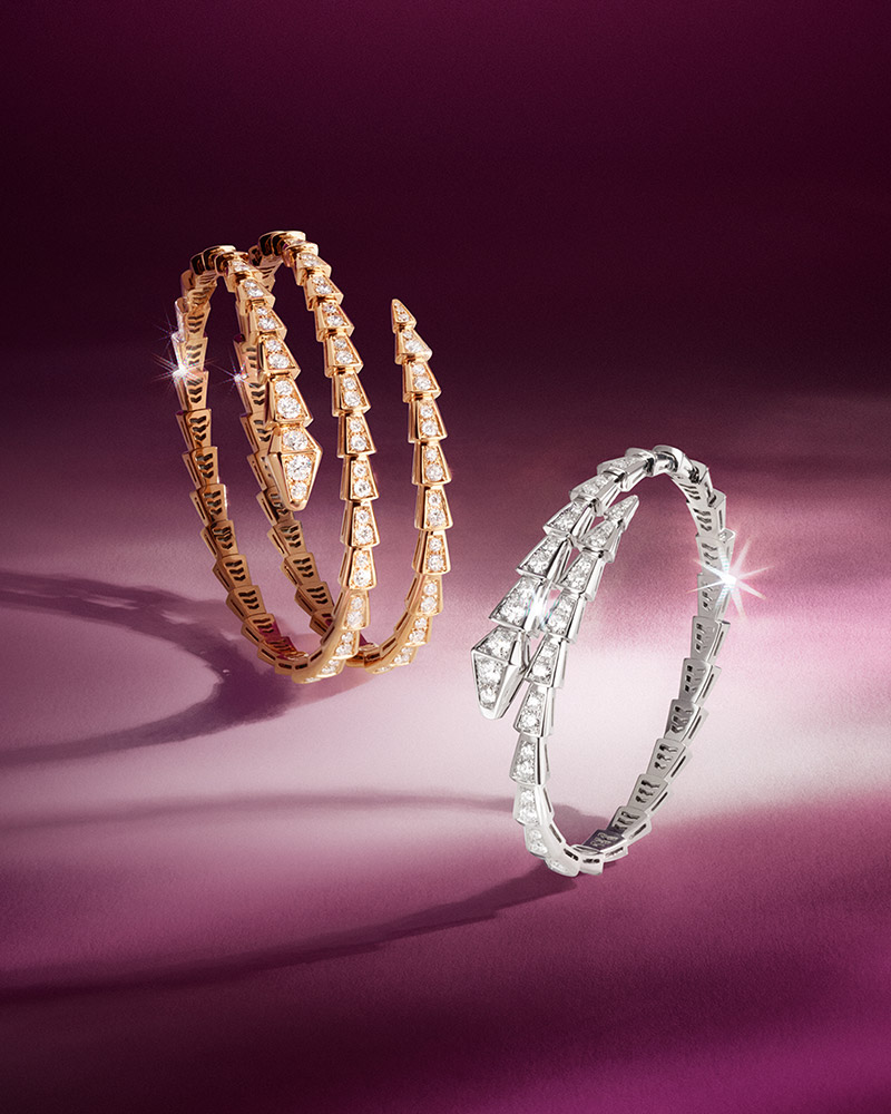 Pulseras Serpenti Viper engastadas en diamantes de oro rosa y oro blanco.