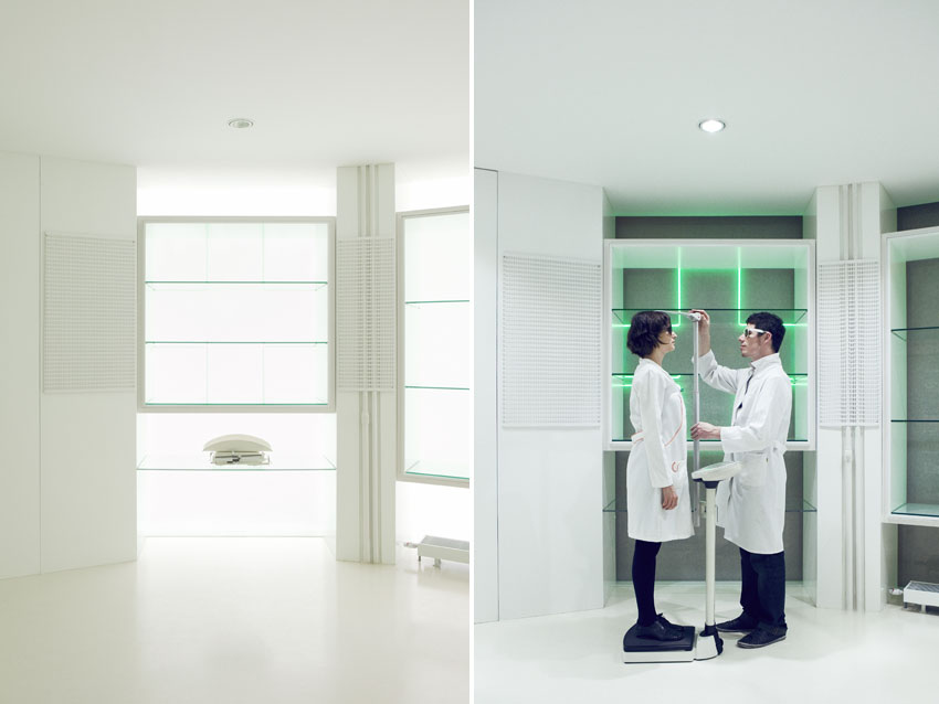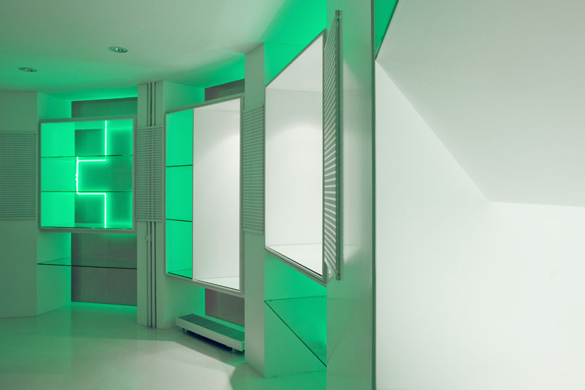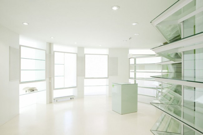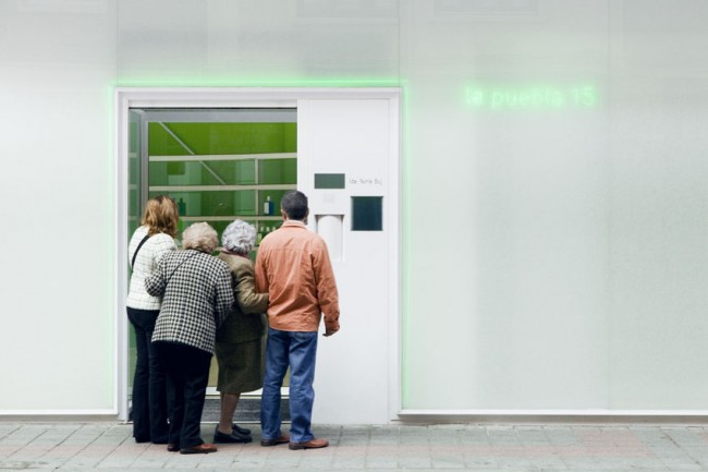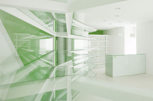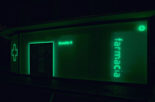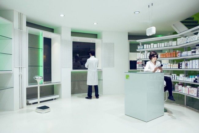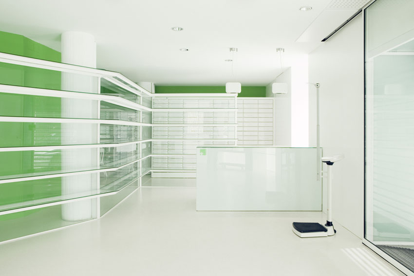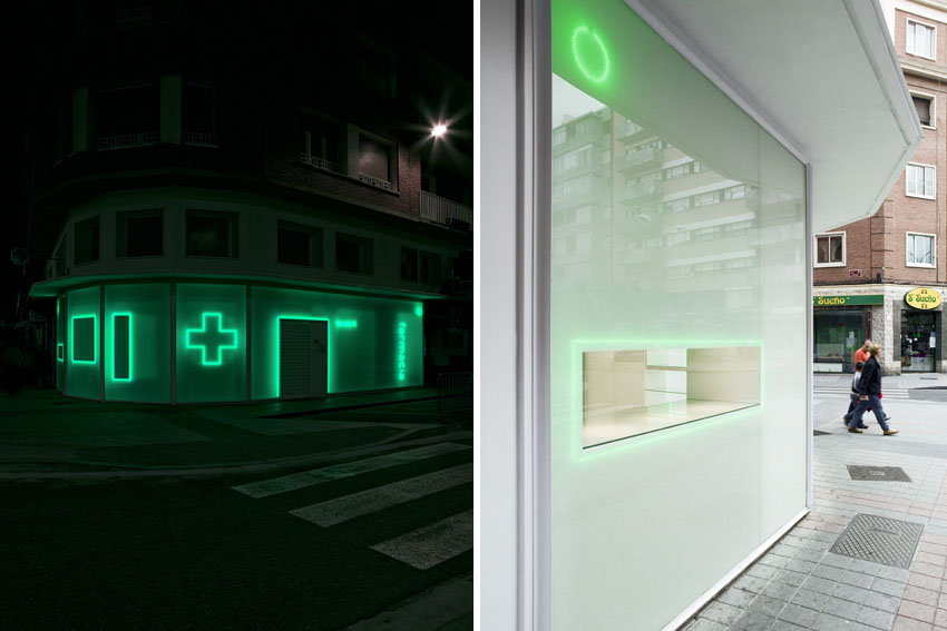 ¿Cómo debería ser el interiorismo de una farmacia? De una farmacia moderna y actual ¿Podríamos utilizar un look retro? ¿Un estilo Castellano, por ejemplo, como el de los mesones toledanos, con armaduras y lámparas con velas falsas?. Sí, claro, una farmacia moderna podría tener ese estilo, el problema es que ahora mismo en España hay muchas farmacias todavía con ese look y no llamaría demasiado la atención. Además las que hay asi son más una broma, diseñada por el propio dueño sin querer, que un proyecto de interiorismo. Cuando desaparezcan todas esas farmacias con look de mesón Castellano entonces una farmacia con ese tipo de interiorismo podría ser la bomba. Mientras que eso ocurre, se agradecen trabajos como el que ha hecho el estudio Buj+Colón con la Farmacia situada en la calle Puebla 15 en Palencia. Un trabajo brillante de pureza, luz y limpieza. Un verde neón que recorre todo el proyecto y que es uno genes corporativos de las farmacias. Lo minimal y sencillo nunca dejará de funcionar, sólo hay que saber cuando y en que momento utilizarlo.