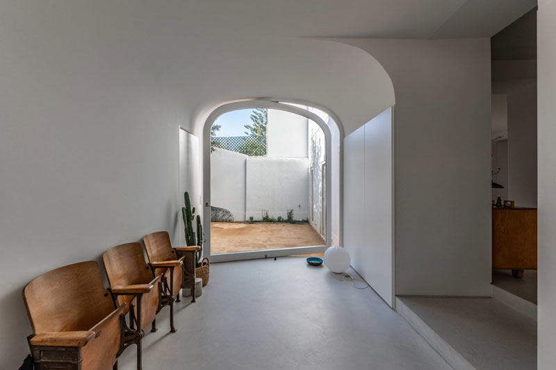 La entrada a Casa Térrea se realiza a través de un vestíbulo abovedado muy bien iluminado por la luz que entra del patio. En la planta baja se encuentra una sala multiusos (área de estar o de estudio), también una cocina, un dormitorio doble con baño y una biblioteca con una escalera que conecta con el cuarto de los niños que está en la primera planta.