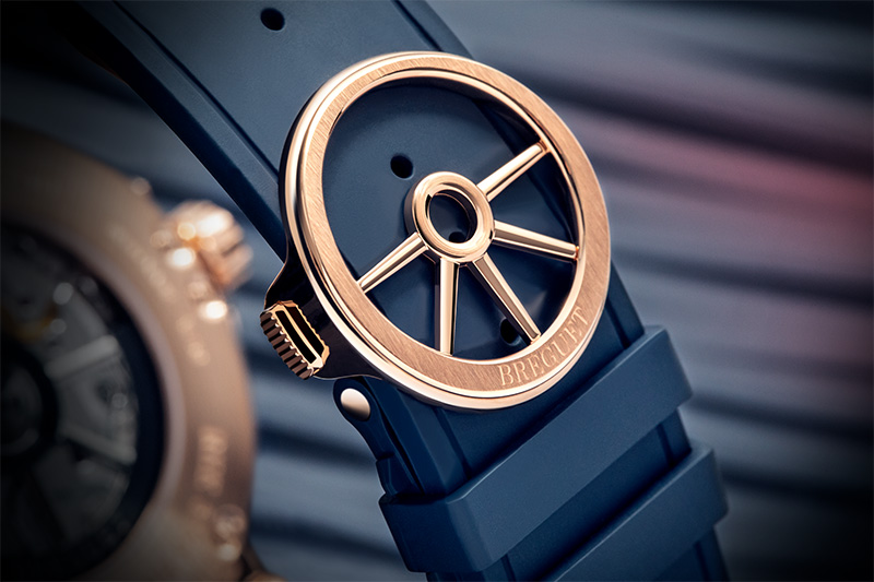 En el reverso del Breguet Marine Hora Mundi Only Watch 2023 tenemos un diseño open back donde podemos ver parte de los mecanismos internos y la masa oscilante del reloj con de timón con acabado en negro. En la caja, un grabado de Piece Unique (pieza única) adorna el reverso de este reloj world time tan especial. La correa, siguiendo el tema marítimo de este reloj, se presenta en goma azul marina decorada por un cierre en forma de timón en oro rosa.