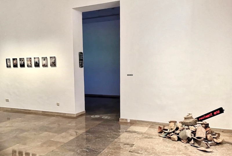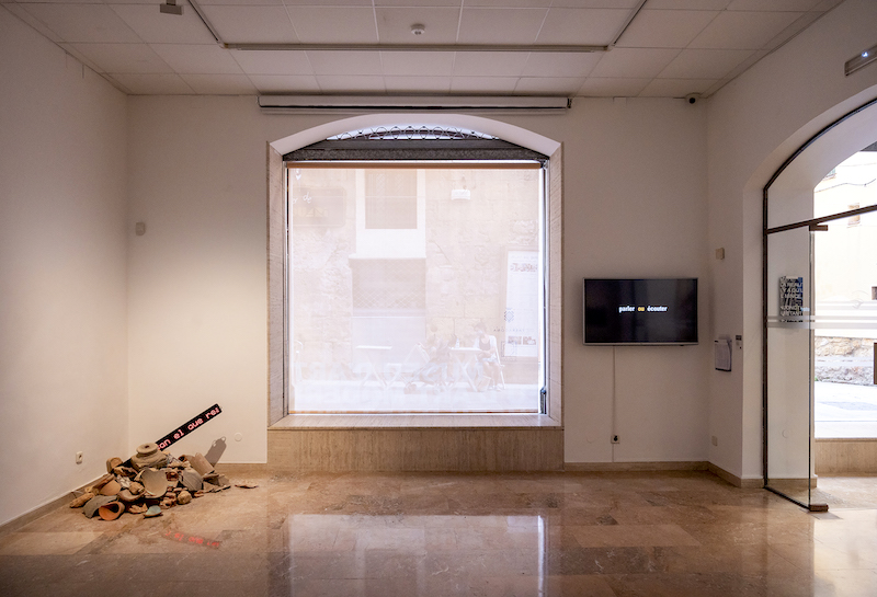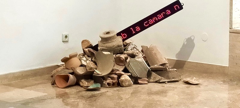 Las ruinas, el fracaso compartido, forman parte de Inventaire, una instalación formada por una pila de material de construcción y escombros de tiempos pasados, a los que se une un display LED en el que se lee, “Con la cámara solo puedo grabar las ruinas que son lo q realmente nos une”, recreando con esta pieza tanto los nuevos exotismos como la alteridad.