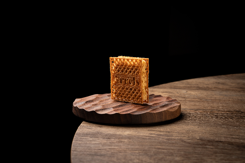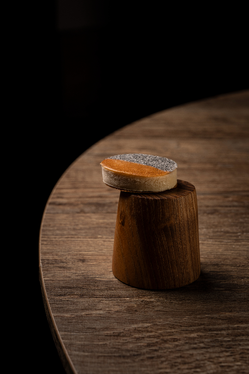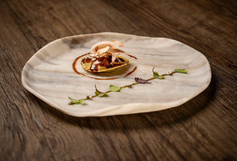 Cremoso de queso de Catí, crujiente de nueces pecanas, corteza enmohecida de manteca y melaza de manzana tatin