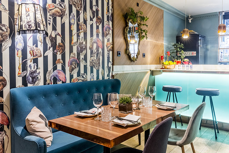 Astrolabius tiene cierto aire clandestino, como el mismo Omar reconoce. Un sótano, pocas mesas, sofás, una barra. Propuesta gastronómica diferente. Pero destila poder evocador con papeles pintados de motivos vegetales sobre las paredes de ladrillo. Las tablas de skate colgadas a la entrada terminan por dar el toque surrealista al asunto.