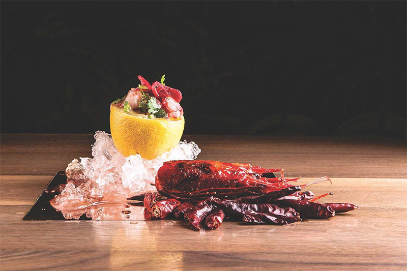 Intenso el Aguachile de Bocado: carabinero a la plancha que, por un lado se come sobre media lima con cilantro, tomatillo verde, crema de aguacate, chile y chipotle, y por otro se devora su cabeza a mano desnuda. Placer loco para los fanáticos chupagambas.
