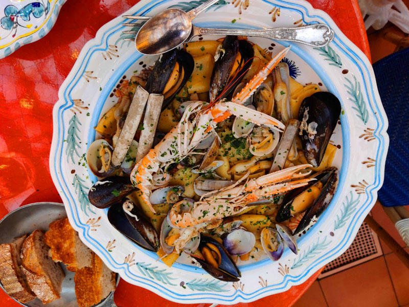 Imagen superior: Ave Marisco. Paccheri cocinados con frutti di mare: cigalas, mejillones, navajas y almejas gallegas con tomate datterino.