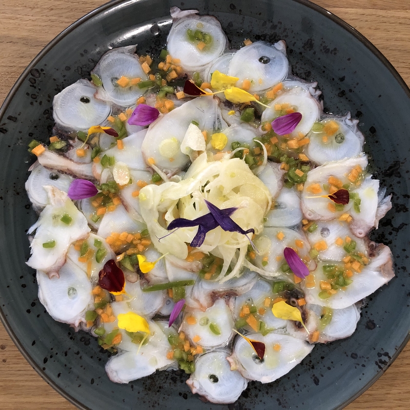 Imagen superior: Restaurante Belleville. Carpaccio de pulpo.