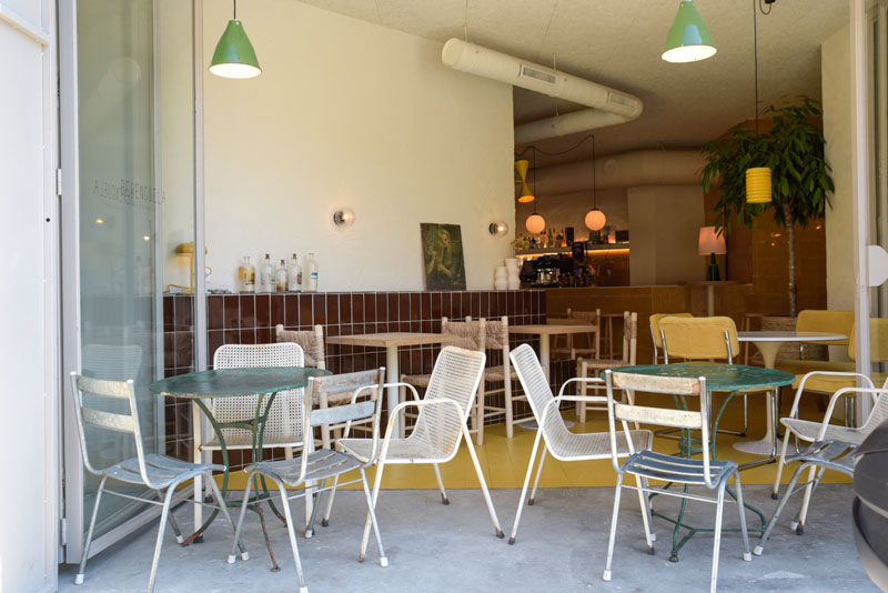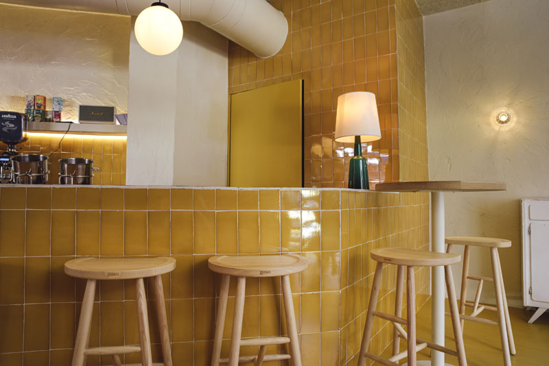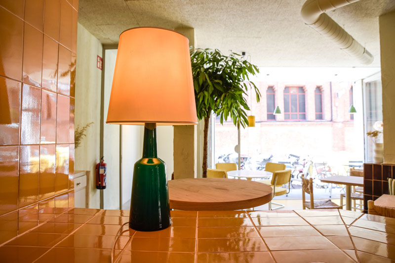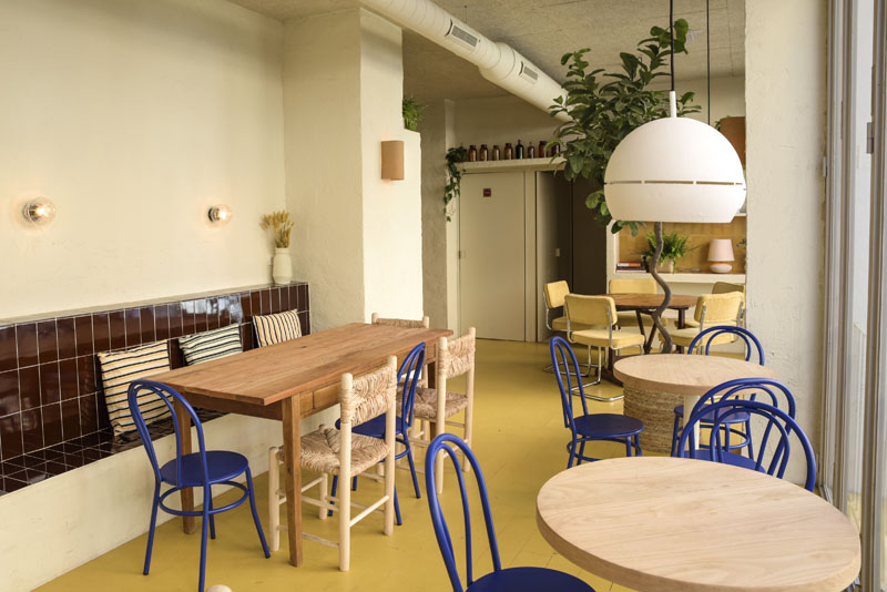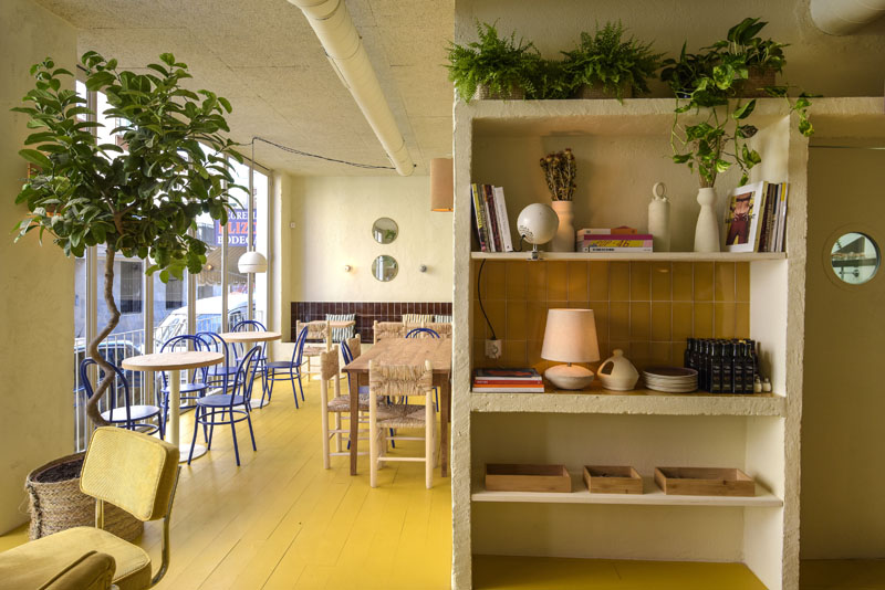El diseño interior lo firma el estudio madrileño Plantea y es un espacio luminoso por el día y con una iluminación muy cálida por la noche. En su conjunto se trabaja principalmente con elementos rústicos de inspiración mediterránea. El mobiliario mezcla piezas de segunda mano con otras nuevas muy eclécticas: Sillas de enea típicas de pueblo, sillas chantelier con tapizado de pana de los años 70s. Otros detalles como los botijos de barro, alicatados de baldosas color mostaza y marrón, bancos de obra o lámparas de los años 50s hacen de este espacio algo inclasificable pero a la vez muy acogedor.