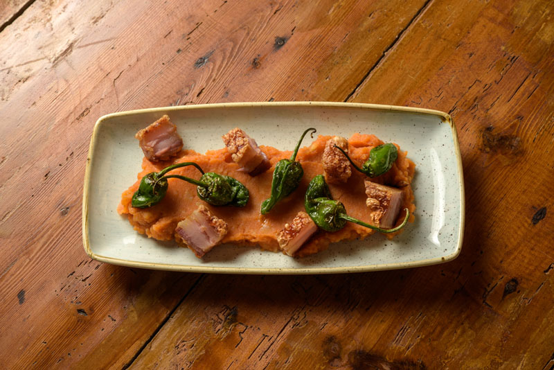 Imagen superior: Patatas Revolconas con Torreznos y Pimientos del Padrón, 11,50€