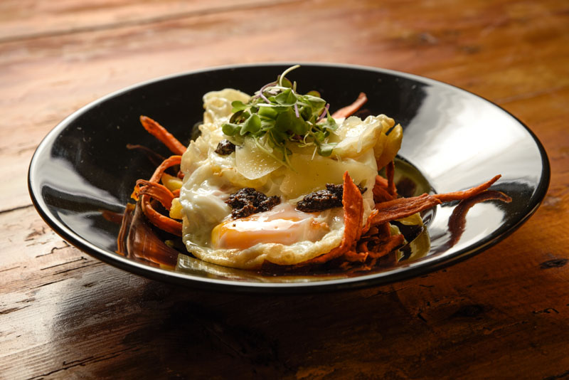 Imagen superior: Huevos Rotos con Patata, Boniato, Trufa y queso Parmesano, 13,50€