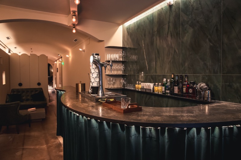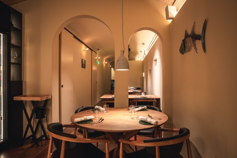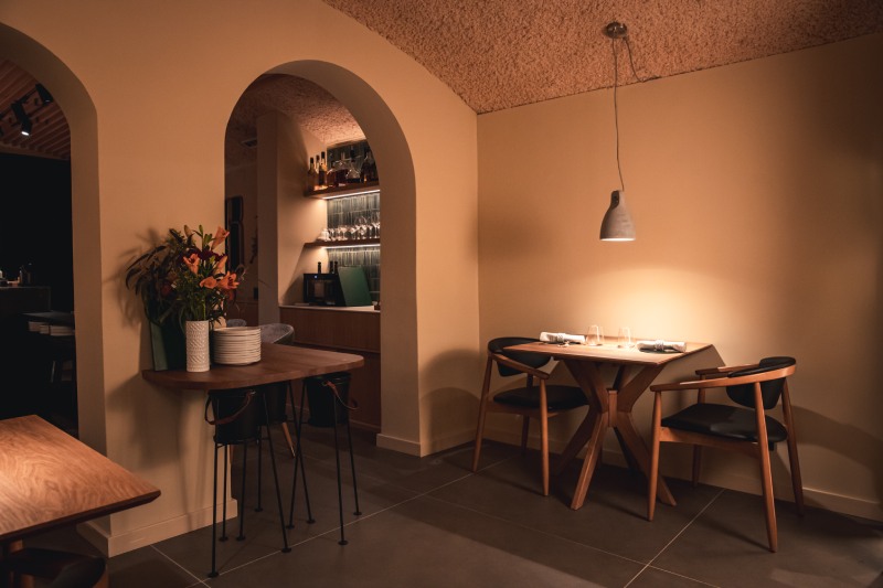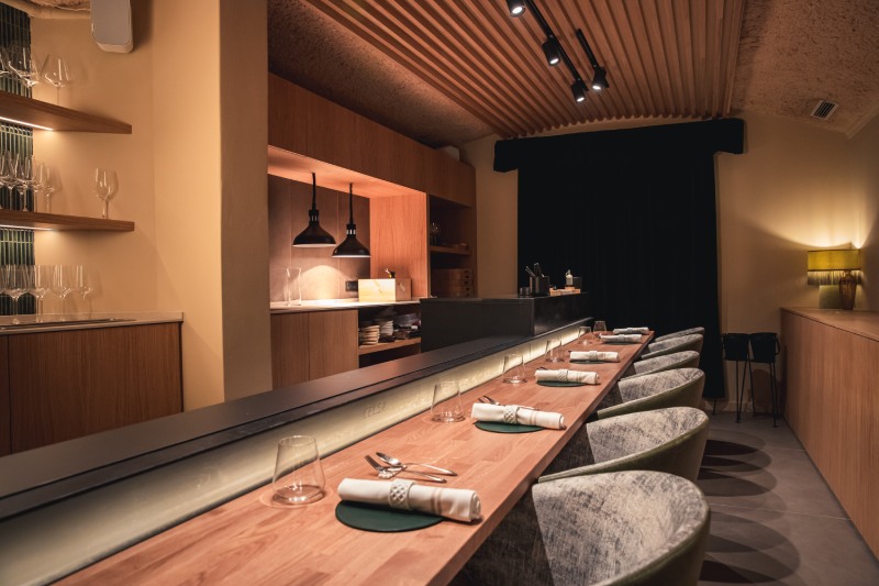 La experiencia comienza en la barra de hierro, rodeada de cerámicas verdes y una cortina de terciopelo, que aporta sofisticación. La iluminación, cuidadosamente distribuida, refuerza la sensación de exclusividad y cercanía. En la zona central, la sala está diseñada para fomentar la conversación, mientras que la cava de vinos y las lámparas suspendidas crean un ambiente cálido y acogedor.