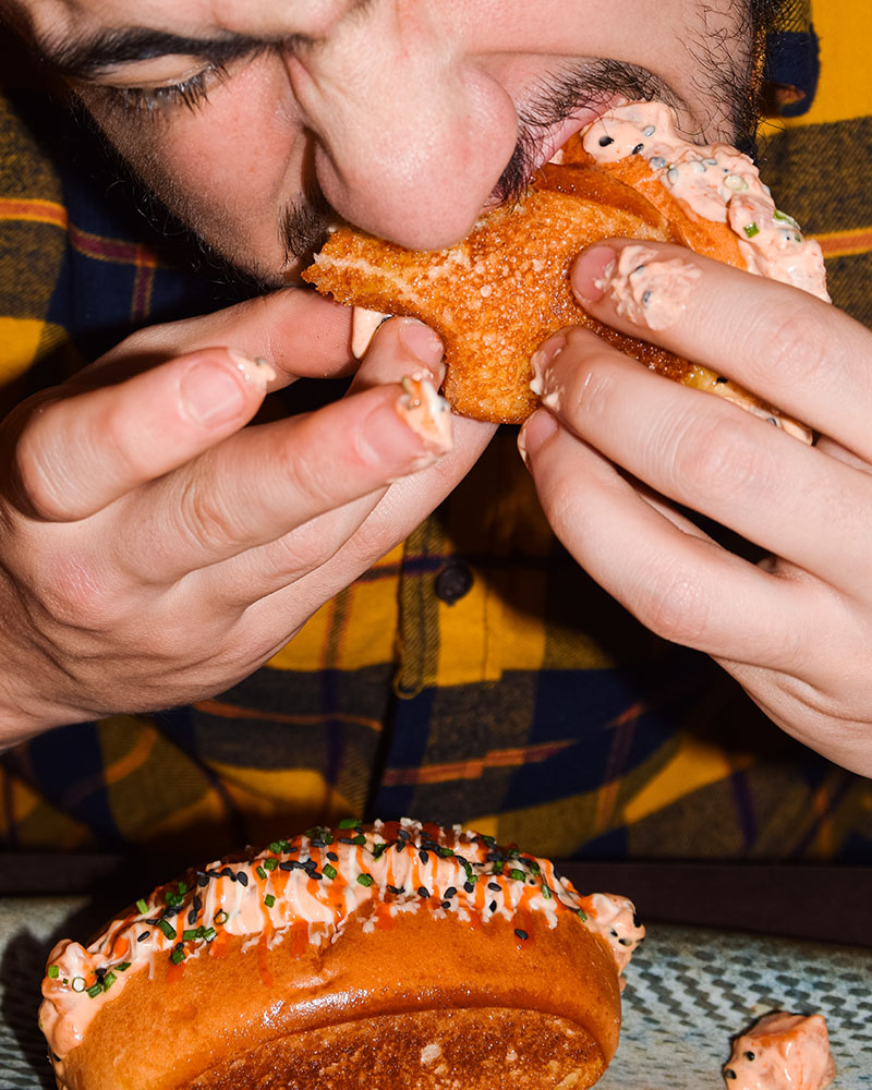 Brioche de Tartar de Salmón (Salmón, mayo, Kiuie, aceite de sesamo, sésamo negro, cebollino y Siracha, brioche) 11€
