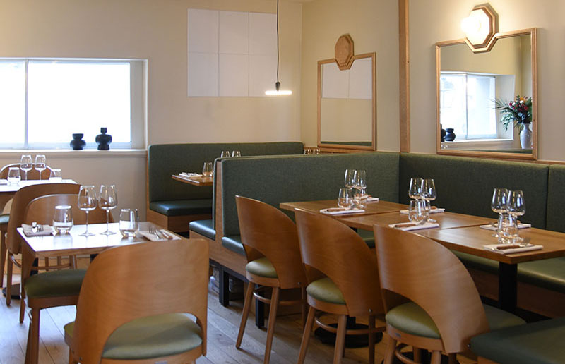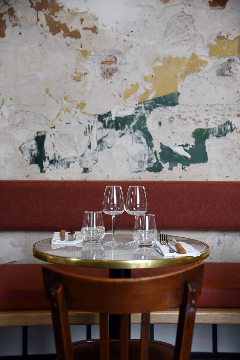 Clásicos de la identidad visual bistró: silla de madera y mesa redonda cobran nuevos aires con la pared despojada y una gama de colores contemporánea ideada por Atelier Etude.
