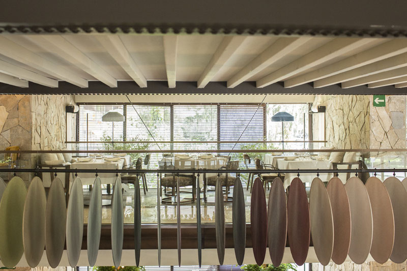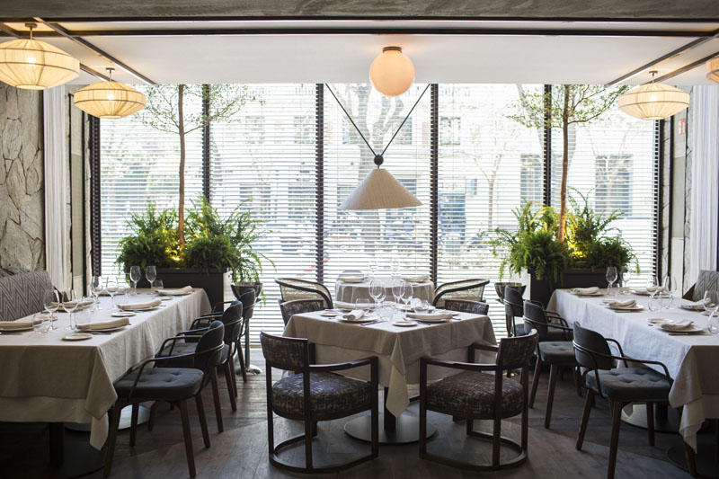 El diseño espacial del restaurante Carbón Negro lo firma el estudio de interiorismo madrileño Proyecto Singular, especializado en trabajos de hostelería. En su portfolio como Perrachica, Peyote San o el Oven Gran Vía. El resultado de Carbón Negro es algo extraño, tiene elementos industriales, toques rústicos como las paredes de piedra, toques barrocos como los taburetes tapizados de madera de la barra, elementos asiáticos como las bonitas lámparas de papel colgantes. No sé si me gusta o no, creo que el eclepticismo se les ha ido un poco de la manos, pero lo que si hay que reconocer que el espacio es cómodo, tiene una iluminación natural increíble, las sillas son confortables y una de las cosas que cada vez le doy más importancia, el ruido de sala está perfectamente resuelto con diversos sistemas de paneles fonoabsorbentes que han dejado a la vista sin ningún complejo.