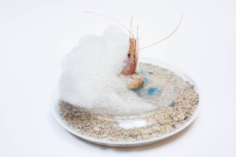 Imagen superior: plato de quisquilla con gel de sus huevas y aire de limón del restaurante Cebo