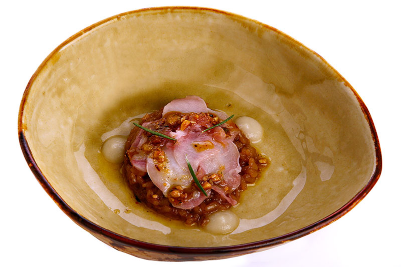 Imagen superior: plato de arroz con carpaccio de conejo y picada catalana del restaurante Cebo