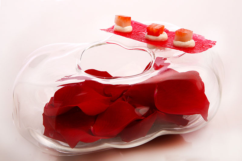 Antes de entrar en acción, ya que estamos y si no tenemos prisa, conviene hacer hambre con una propuesta de cócteles de aperitivo muy afinada y hasta original gracias a la creatividad de Carlo en el Glass Bar. Versiones de spritz, mezclas con champán y en general tragos equilibrados y fáciles de beber para todos los públicos. Sirva de ejemplo, un cóctel con mezcal, Campari, vermú rojo, sake, mermelada de naranja amarga, zumo de limón, clara de huevo y pétalo de rosa. En este momento de preámbulo, van desfilando los snacks (olé esa falsa ostra tan divertida) si el menú degustación ya está en camino. Para hacer más flexible la visita al restaurante Cebo, además de este menú de 18 pases tasado en 85 euros sin vino -tarifa ultra competitiva para la fórmula que estamos comprando- hay posibilidad de tirar de una carta con la que poder fidelizar y ajustar más la comanda tanto en precio como en gustos y tiempos. Bravo por ello. Al fin y al cabo esto es un restaurante de hotel y hay que dar todas las facilidades posibles.