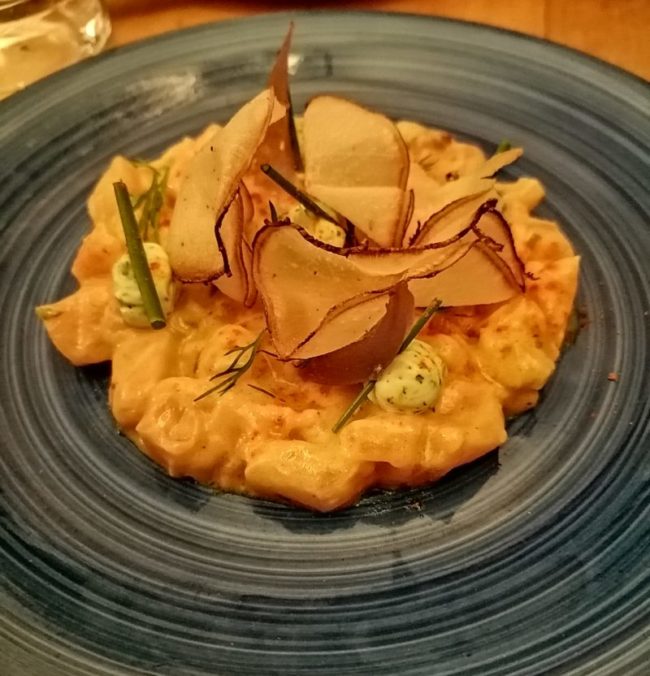 Yo escogí ese menú del que hablo (aunque puedes ir a hacer sólo unos cuantos platillos) y comí 10 platos redondos, sabrosos, que me dejaron contenta y nada pesada. Fueron los del menú degustación, que empezó por una anchoa angelet de curación casera, finísima, un filete de mar sobre la lengua. Llevaba unos puntos de salsa holandesa y reposaba sobre un pedazo de pan carasau, un producto del ingenio sardo llamado ‘carta da musica’ en el resto de Italia por su elevada dosis de crujencia. Crujosidad. Crujentismo. Que cruje, vaya. Que cruix. ¿Se entiende?