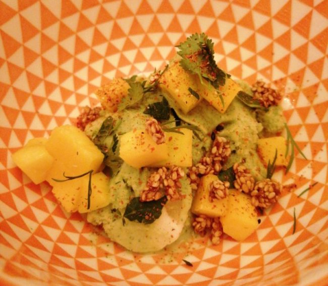 Restaurante Cruix: el postre Piñazo en la pradera, de mango con sorbete curry verde y guirlache de sésamo