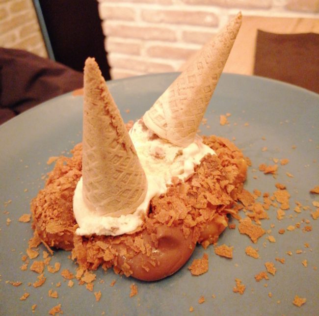 Restaurante Cruix: el postre Día Triste en la Playa, dos pequeños conos de helado de vainilla que se cayeron encima de una crema de chocolate