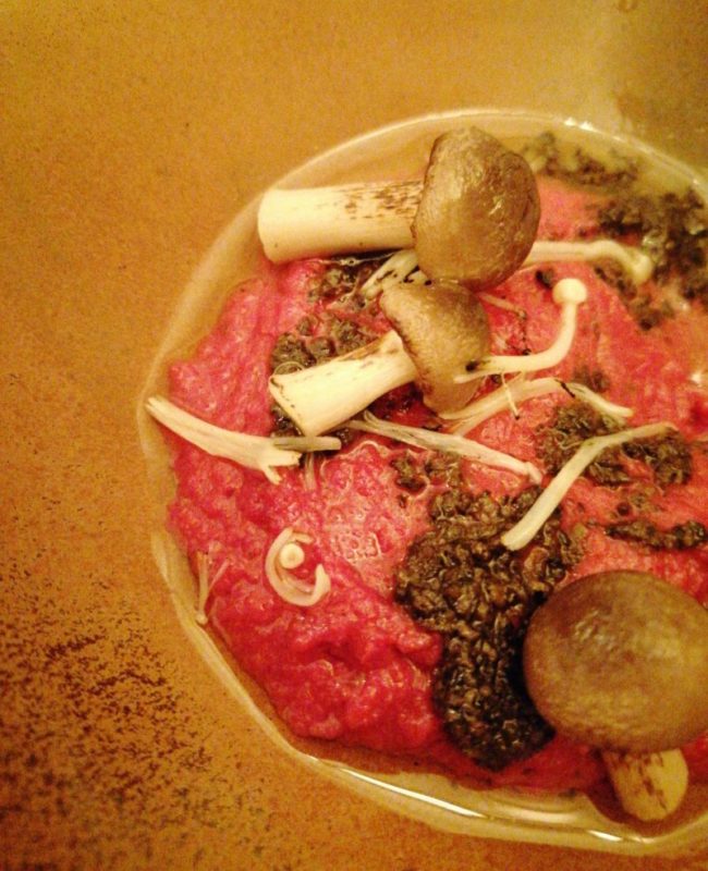 Y siguieron llegando platillos en lo que me pareció la ración justa que te permite compartir y seguir animada para probar más. El hummus de remolacha con setas y trufa hizo su aparición como el cartel de neón de un dinner cuando aprieta el hambre: fucsia chillón y envuelto en un aroma que te hace salivar. Pero, ¿qué me digo? No estamos en Portland ni en Los Angeles y aquí se viene a dinar o sopar, que es lo que hacemos los catalanes dos veces al día para llenarnos la panxa. Garantías de hacerlo bien: ir a comer a Cruix.