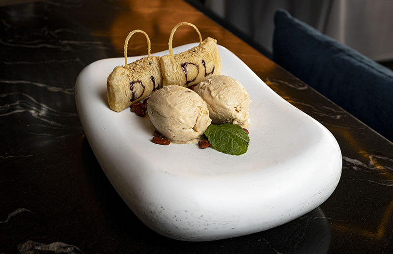 Para terminar, el restaurante propone un postre divertido y original, que hace honor a su nombre: el trampantojo de Bolso Don Lay. Se trata de un hojaldre relleno de crema pastelera y té macha, que imita la forma de un bolso de mano, y que se acompaña de helado de galleta. Un dulce capricho que pone el broche de oro a esta experiencia gastronómica.