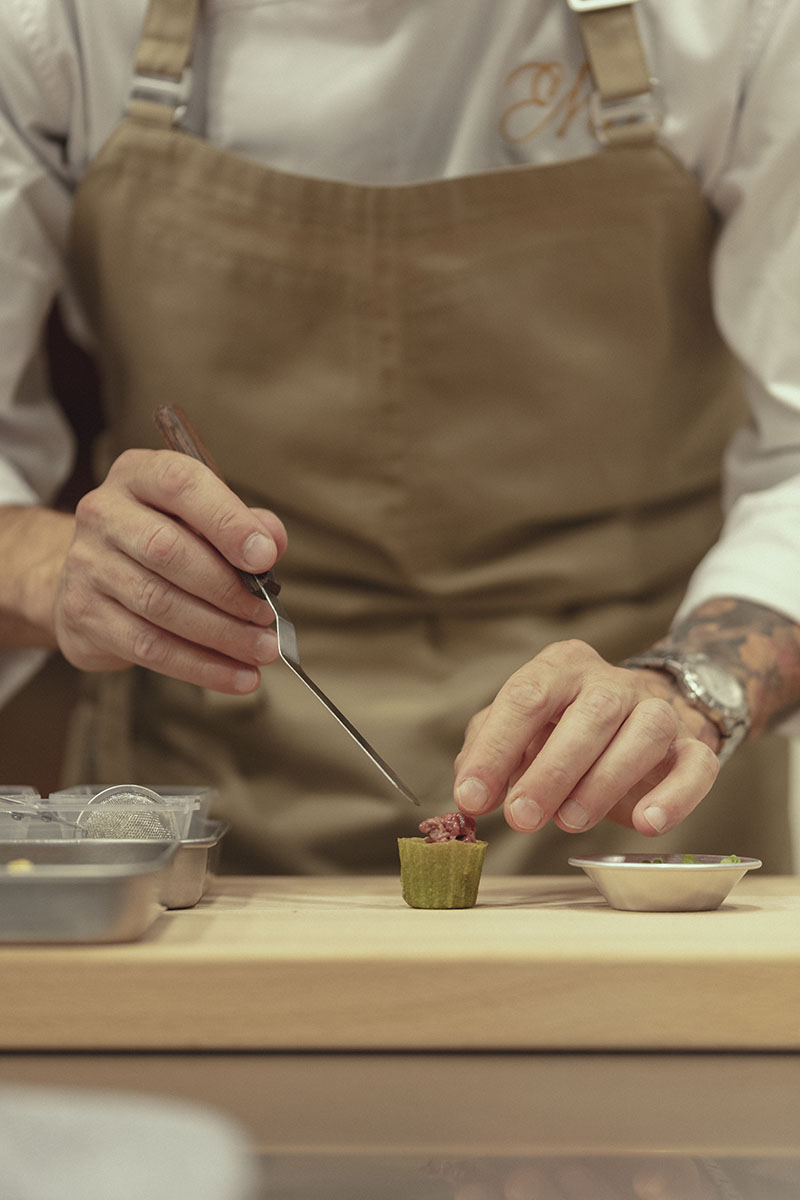 Tras formarse y trabajar en algunas de las cocinas más influyentes del mundo —Azurmendi, Noma en Copenhague, Geranium, Il Ristorante Luca Fantin en Tokio, Minibar by José Andrés en Washington— y culminar como jefe de I+D en Atomix (Nueva York), ha vivido desde dentro la excelencia de la alta gastronomía global.