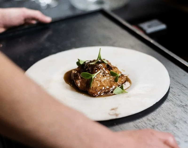 Siendo extremeño, no podía faltar la casquería y nos sorprende con una molleja de corazón acompañada de una salsa demiglace. Una molleja elaborada a baja temperatura acabada a la brasa. Otro plato sencillo de Ricardo Señorán, pero con mucha cocina detrás, donde el maridaje de un vino amontillado le va a la perfección.