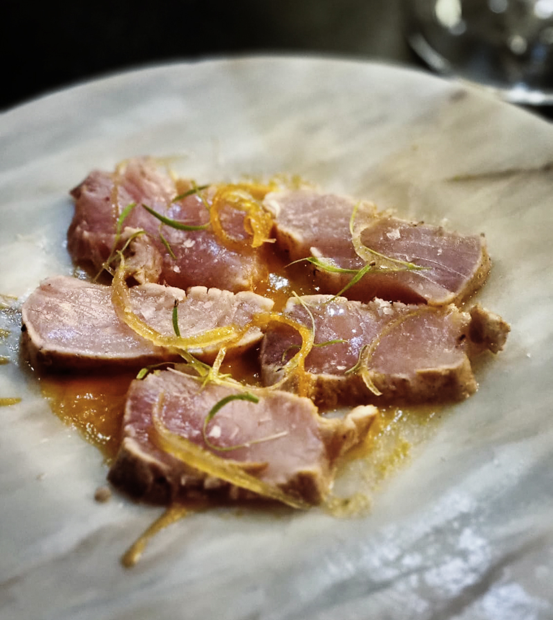 Seguimos con las verduras como elemento principal. La berenjena a la brasa de sarmiento, con caldo de cocido y un pequeño toque de kimchi, tres elementos muy sencillos, pero de un sabor y una ejecución magnifica. Una elaboración que nos viene maridada con una sidra de hielo, dándole un contraste que casa a la perfección con el salado y el amargo de la berenjena. El bonito, como no, con cítricos es el siguiente plato. Un bonito hecho a la brasa con un toque cítrico muy logrado y que funciona a la perfección.