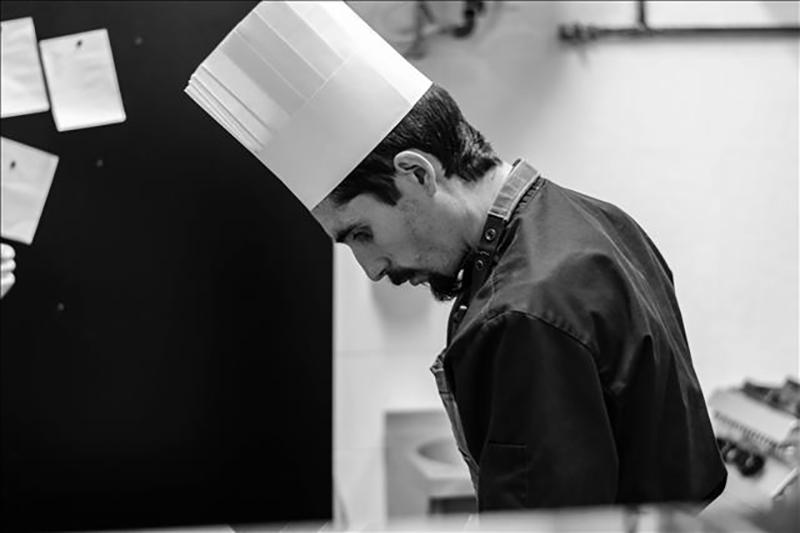 Ricardo Señoran, Plasencia 1985, podría ser un personaje sacado de una película de los hermanos Coen. Formado en la escuela de hostelería de su ciudad, se forja en cocinas como Perelada o Peix & Brases, de donde se lleva el respeto absoluto del producto; Marqués de Riscal, en la Rioja o Diverxo, de este último, nos confiesa que le marca el dominio del sabor. Paseando con su perro Rayo, se inspira en las formas, los colores y los olores, pero más allá de elementos abstractos, para Ricardo la cocina tradicional extremeña, junto a la asturiana, es un punto de partida de lo que él llama pre-inspiración. Ricardo Señoran, se evade del estrés cosiendo a maquina y arreglando aparatos estropeados.