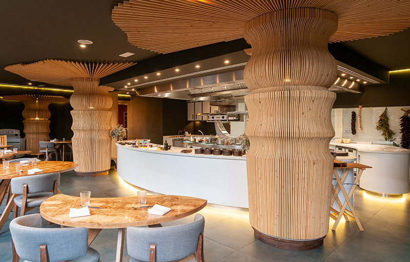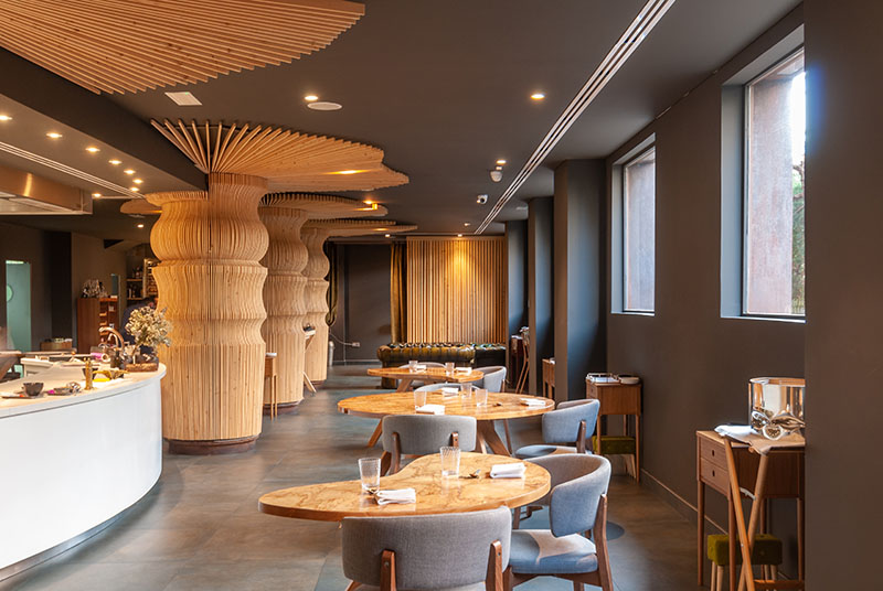 El escenario del restaurante Gaytán, al contrario que su contenida propuesta culinaria, sí se expande en capacidad espacial y en pegada visual. La sala se antoja inmensa para sumar tan pocas mesas. Como buen gastronómico, cabría añadir. En el comedor luminoso, ideado por la ambiciosa mente del cocinero y por Gabinete Técnico Áurea, destacan los pilares circulares a modo de troncos de baobabs. Cero peso ornamental. Minimalismo hasta en la paleta cromática, de la madera clara al gris cemento y para de contar.