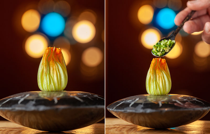Imágenes superiores: Risotto de calabacín y velo de flor, y Chipirón, eneldo, chirivía y velouté de cebolla cítrica
