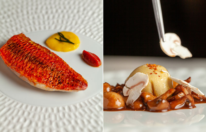 Imágenes superiores: vista general, el salmonete y la yema de huevo cubierta con velo de foie sobre cama de champiñón botón al oporto