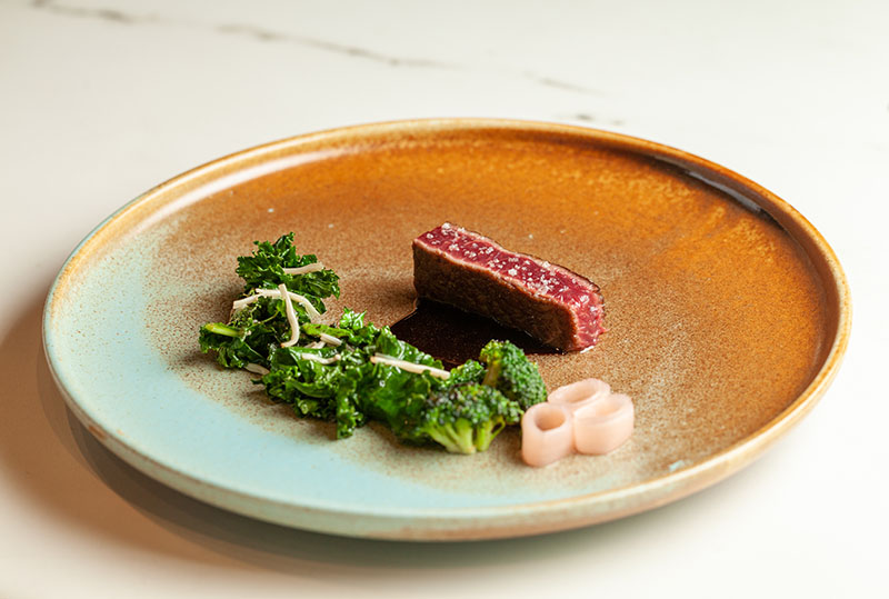 Imagen superior: Lomo de vaca rubia gallega con espárrago blanco y kale