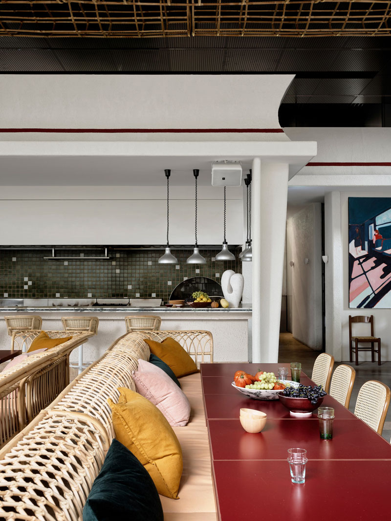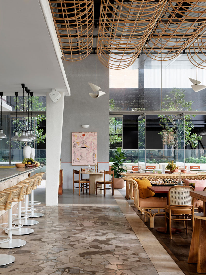 Glorieta es un restaurante con una capacidad de 220 comensales al que se le aplicó un paleta de color terrosa, orgánica y cálida a través de la cuidadosa selección de muebles y accesorios contemporáneos de calidad. Madera reciclada, cueros y baldosas de color olivo y albaricoque, mesas de color rojo óxido, latón y cortinas de lino color trigo llenan el lugar, mientras que un “paisaje de nubes” de ratán abovedado oscurece el impacto de los paneles de techo metálicos y ofrece otra capa de calidez y textura natural al espacio.